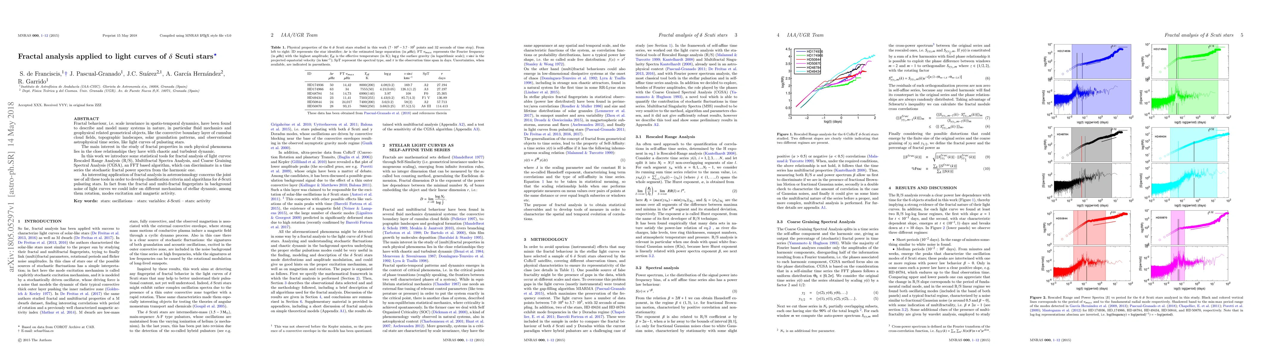 Fractal behaviour, i.e. scale invariance in spatio-temporal dynamics, have been found to describe and model many systems in nature, in particular fluid mechanics and geophysical related geometrical objects, like the convective boundary layer of cumulus cloud fields, topographic landscapes, solar granulation patterns, and observational astrophysical time series, like light curves of pulsating stars. The main interest in the study of fractal properties in such physical phenomena lies in the close relationships they have with chaotic and turbulent dynamic. In this work we introduce some statistical tools for fractal analysis of light curves: Rescaled Range Analysis (R/S), Multifractal Spectra Analysis, and Coarse Graining Spectral Analysis (CGSA), an FFT based algorithm, which can discriminate in a time series the stochastic fractal power spectra from the harmonic one. An interesting application of fractal analysis in asteroseismology concerns the joint use of all these tools in order to develop classification criteria and algorithms for {\delta}-Scuti pulsating stars. In fact from the fractal and multi-fractal fingerprints in background noise of light curves we could infer on different mechanism of stellar dynamic, among them rotation, modes excitation and magnetic activity.