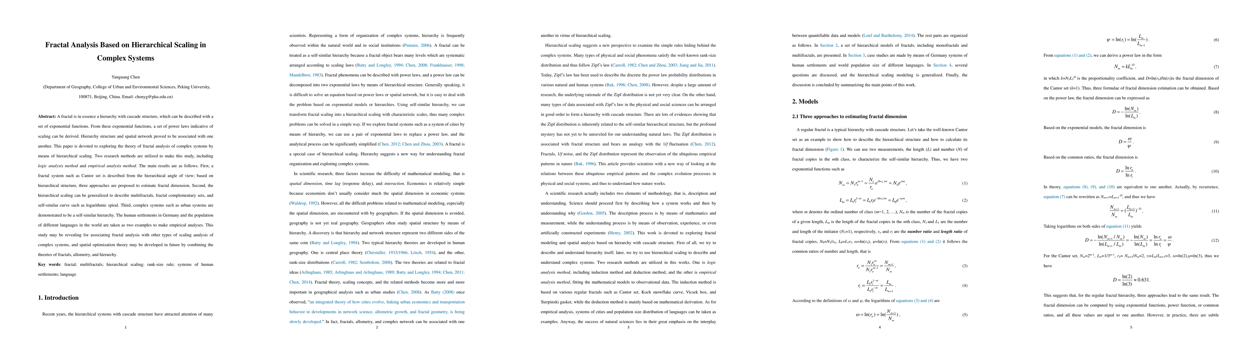 This paper explores fractal analysis of complex systems using hierarchical scaling, proposing methods to estimate fractal dimension and generalizing the approach to multifractals and self-similar curves. Empirical analyses on urban systems and language populations support the theory of self-similar hierarchies in complex systems.