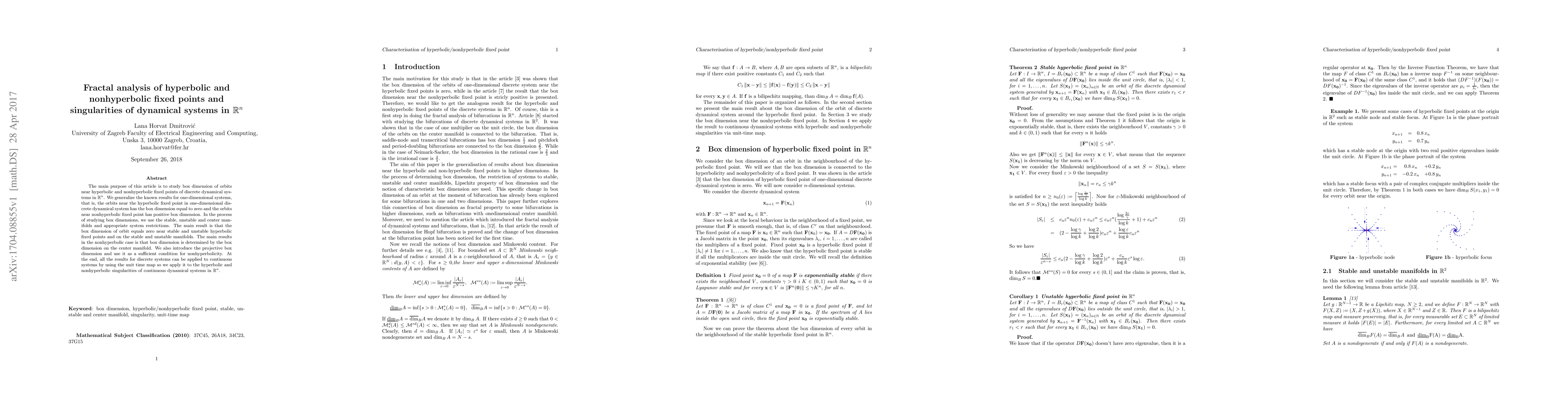 The main purpose of this article is to study box dimension of orbits near hyperbolic and nonhyperbolic fixed points of discrete dynamical systems in higher dimensions. We generalize the known results for one-dimensional systems, that is, the orbits near the hyperbolic fixed point in one-dimensional discrete dynamical system has the box dimension equal to zero and the orbits near nonhyperbolic fixed point has positive box dimension. In the process of studying box dimensions, we use the stable, unstable and center manifolds and appropriate system restrictions. The main result is that the box dimension of orbit equals zero near stable and unstable hyperbolic fixed points and on the stable and unstable manifolds. The main results in the nonhyperbolic case is that box dimension is determined by the box dimension on the center manifold. We also introduce the projective box dimension and use it as a sufficient condition for nonhyperbolicity. At the end, all the results for discrete systems can be applied to continuous systems by using the unit time map so we apply it to the hyperbolic and nonhyperbolic singularities of continuous dynamical systems in higher dimensions.