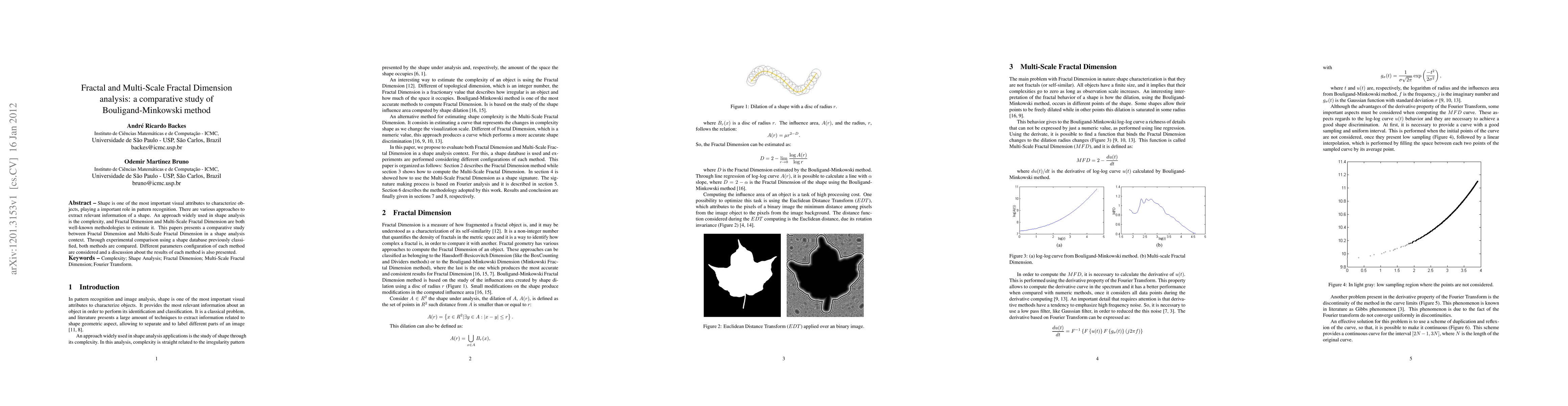 This paper compares Fractal Dimension and Multi-Scale Fractal Dimension methodologies for shape analysis, using a Bouligand-Minkowski method approach. Experimental results from a classified shape database highlight the effectiveness of each method under different parameter configurations.