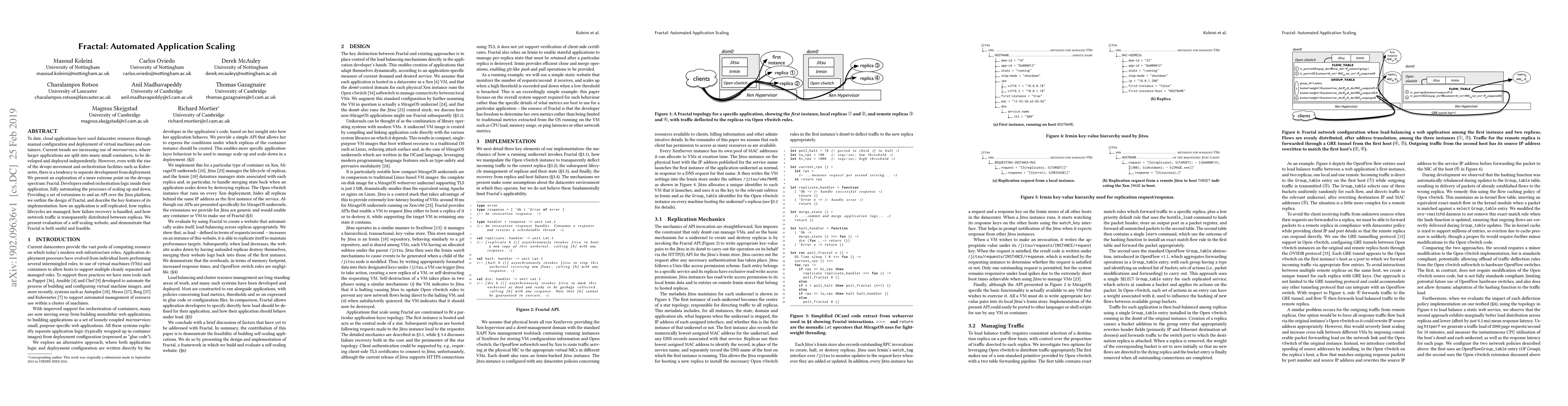 To date, cloud applications have used datacenter resources through manual configuration and deployment of virtual machines and containers. Current trends see increasing use of microservices, where larger applications are split into many small containers, to be developed and deployed independently. However, even with the rise of the devops movement and orchestration facilities such as Kubernetes, there is a tendency to separate development from deployment. We present an exploration of a more extreme point on the devops spectrum: Fractal. Developers embed orchestration logic inside their application, fully automating the processes of scaling up and down. Providing a set of extensions to and an API over the Jitsu platform, we outline the design of Fractal and describe the key features of its implementation: how an application is self-replicated, how replica lifecycles are managed, how failure recovery is handled, and how network traffic is transparently distributed between replicas. We present evaluation of a self-scaling website, and demonstrate that Fractal is both useful and feasible.