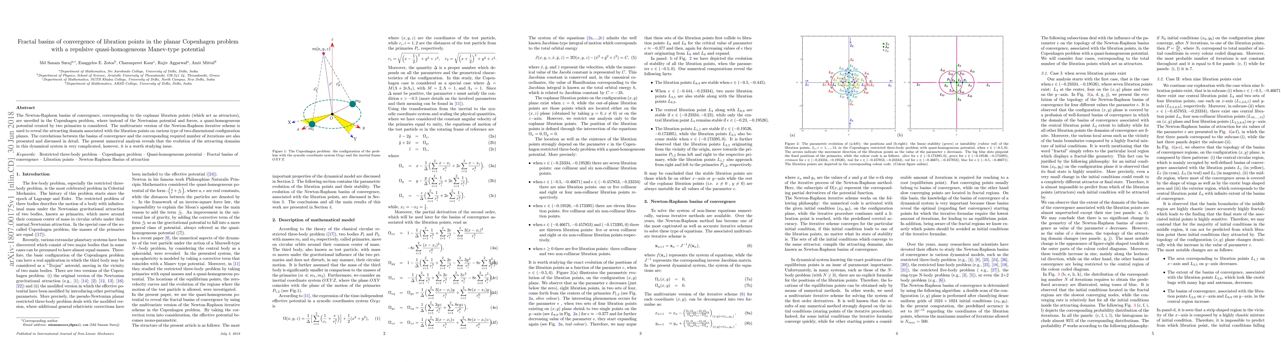 This paper investigates the fractal basins of convergence for libration points in the planar Copenhagen problem using a Manev-type repulsive potential. It employs the Newton-Raphson method to explore the attracting domains and correlates the convergence basins with the number of iterations required, highlighting the complex evolution of these domains.