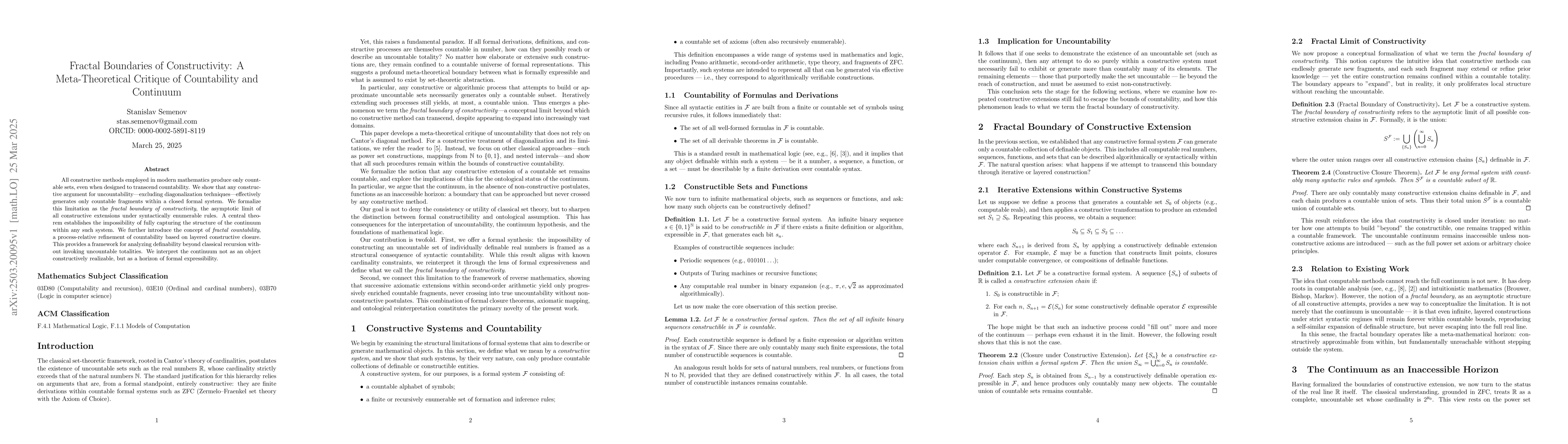 The paper's novelty lies in its meta-theoretical approach to understanding the limitations of constructive methods, proposing 'fractal countability' as a new framework for analyzing definability, and interpreting the continuum as a horizon of formal expressibility rather than a constructively realizable object.