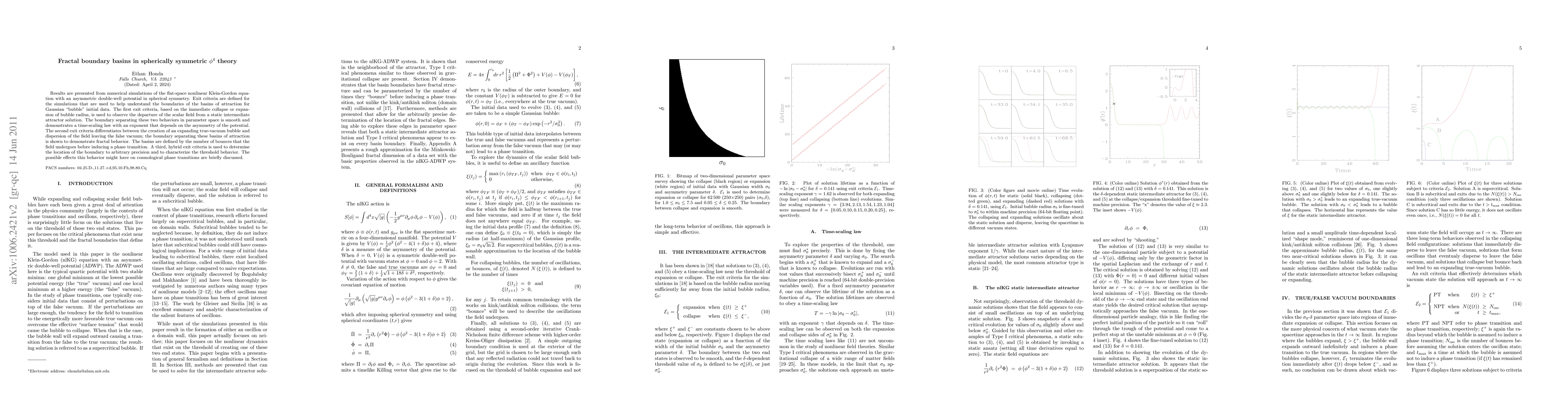 Results are presented from numerical simulations of the flat-space nonlinear Klein-Gordon equa- tion with an asymmetric double-well potential in spherical symmetry. Exit criteria are defined for the simulations that are used to help understand the boundaries of the basins of attraction for Gaussian "bubble" initial data. The first exit criteria, based on the immediate collapse or expan- sion of bubble radius, is used to observe the departure of the scalar field from a static intermediate attractor solution. The boundary separating these two behaviors in parameter space is smooth and demonstrates a time-scaling law with an exponent that depends on the asymmetry of the potential. The second exit criteria differentiates between the creation of an expanding true-vacuum bubble and dispersion of the field leaving the false vacuum; the boundary separating these basins of attraction is shown to demonstrate fractal behavior. The basins are defined by the number of bounces that the field undergoes before inducing a phase transition. A third, hybrid exit criteria is used to determine the location of the boundary to arbitrary precision and to characterize the threshold behavior. The possible effects this behavior might have on cosmological phase transitions are briefly discussed.