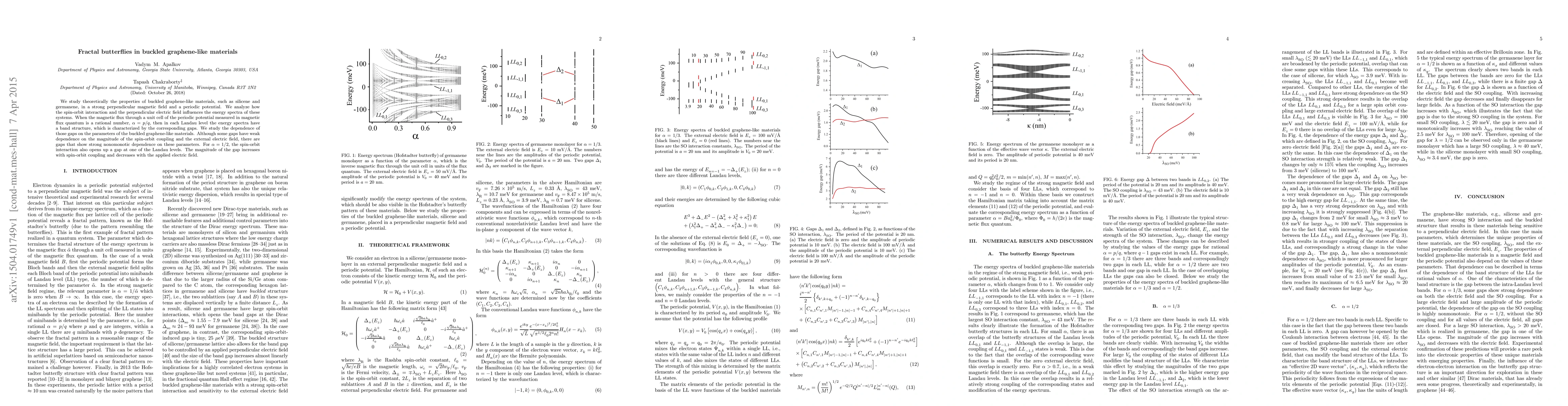 This paper investigates the energy spectra of buckled graphene-like materials under a strong magnetic field and periodic potential, finding that spin-orbit interaction and electric fields influence band structures. Notably, a magnetic flux of 1/2 induces a gap in one Landau level, whose size varies with spin-orbit coupling and electric field strength.