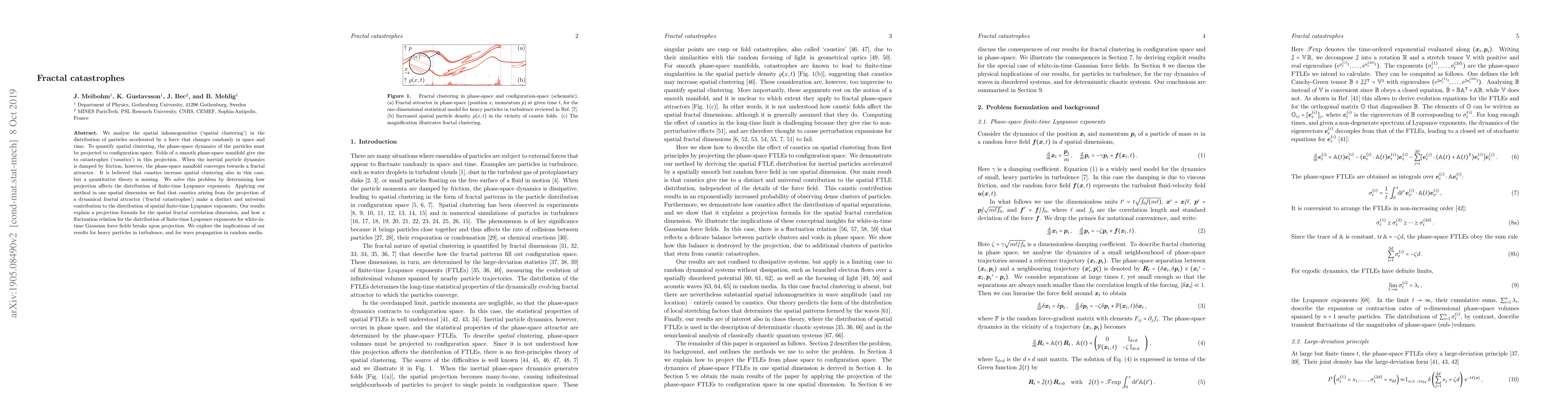 We analyse the spatial inhomogeneities ('spatial clustering') in the distribution of particles accelerated by a force that changes randomly in space and time. To quantify spatial clustering, the phase-space dynamics of the particles must be projected to configuration space. Folds of a smooth phase-space manifold give rise to catastrophes ('caustics') in this projection. When the inertial particle dynamics is damped by friction, however, the phase-space manifold converges towards a fractal attractor. It is believed that caustics increase spatial clustering also in this case, but a quantitative theory is missing. We solve this problem by determining how projection affects the distribution of finite-time Lyapunov exponents. Applying our method in one spatial dimension we find that caustics arising from the projection of a dynamical fractal attractor ('fractal catastrophes') make a distinct and universal contribution to the distribution of spatial finite-time Lyapunov exponents. Our results explain a projection formula for the spatial fractal correlation dimension, and how a fluctuation relation for the distribution of finite-time Lyapunov exponents for white-in-time Gaussian force fields breaks upon projection. We explore the implications of our results for heavy particles in turbulence, and for wave propagation in random media.