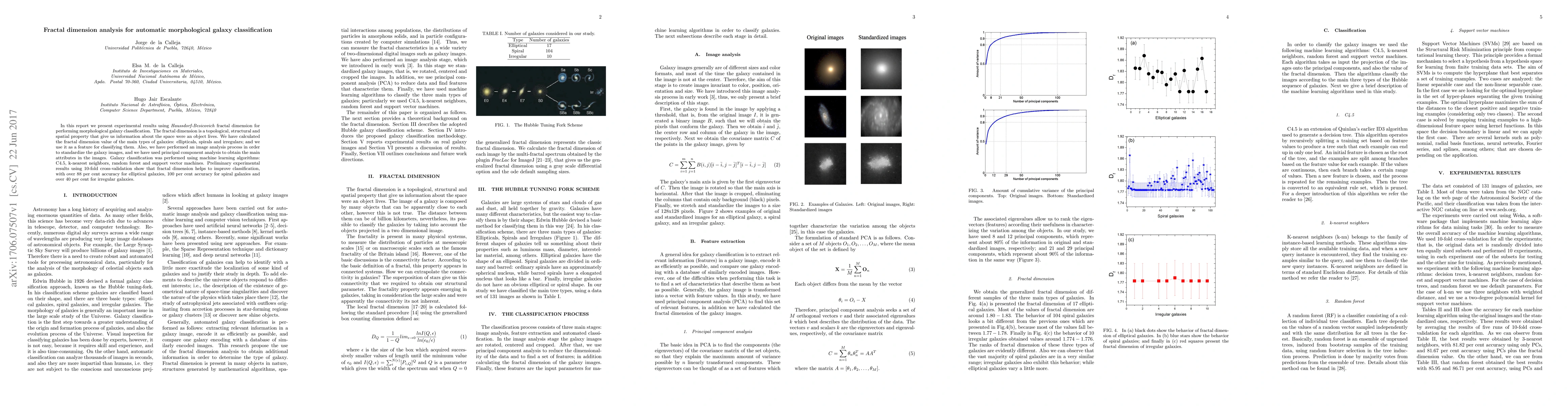 This paper explores the use of fractal dimension, specifically the Hausdorff-Besicovich fractal dimension, for classifying galaxies into elliptical, spiral, and irregular types. Machine learning algorithms achieved high accuracy, with notable results showing 88% accuracy for elliptical galaxies and 100% for spiral galaxies, indicating the effectiveness of fractal dimension as a classification feature.