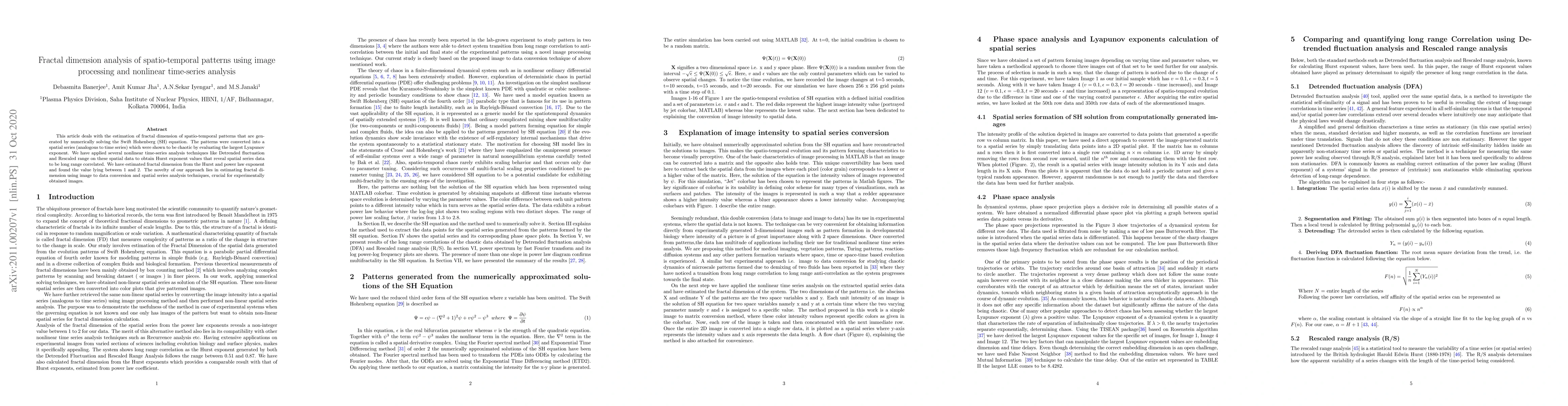 This article deals with the estimation of fractal dimension of spatio-temporal patterns that are generated by numerically solving the Swift Hohenberg (SH) equation. The patterns were converted into a spatial series (analogous to time series) which were shown to be chaotic by evaluating the largest Lyapunov exponent. We have applied several nonlinear time-series analysis techniques like Detrended fluctuation and Rescaled range on these spatial data to obtain Hurst exponent values that reveal spatial series data to be long range correlated. We have estimated fractal dimension from the Hurst and power law exponent and found the value lying between 1 and 2. The novelty of our approach lies in estimating fractal dimension using image to data conversion and spatial series analysis techniques, crucial for experimentally obtained images.