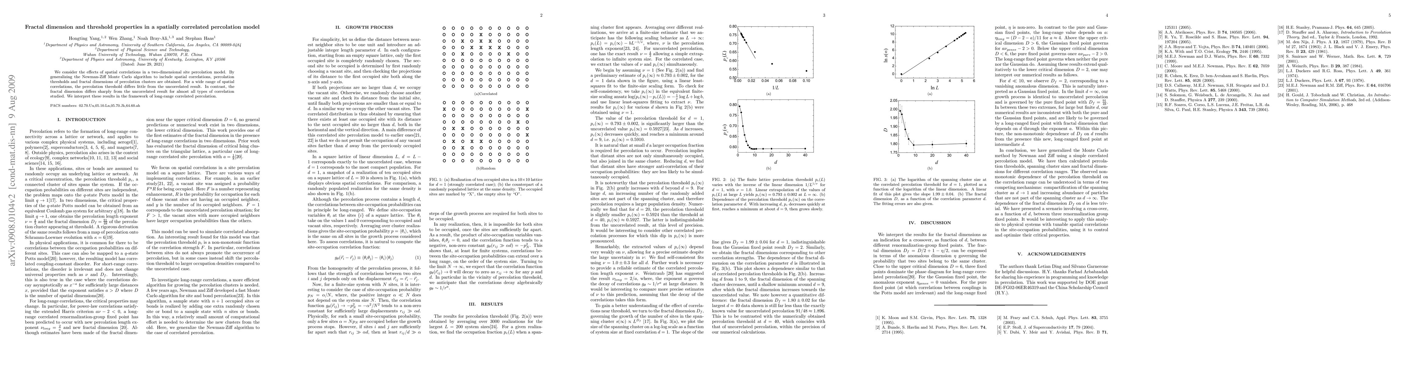 This paper investigates the impact of spatial correlations in a two-dimensional site percolation model, finding that while percolation thresholds remain nearly unchanged, fractal dimensions significantly vary. The results are analyzed within the context of long-range correlated percolation.