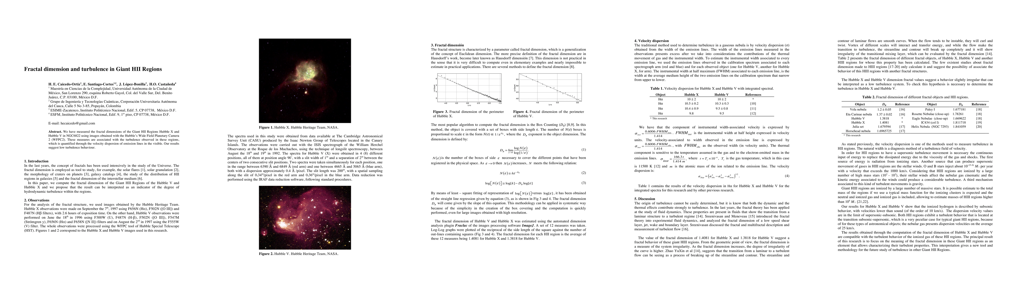 This study measures the fractal dimensions of Giant HII Regions Hubble X and Hubble V in NGC6822 using Hubble's WFPC2 images, linking these dimensions to the observed turbulence quantified via emission line velocity dispersion. The findings indicate low turbulence behavior in these regions.