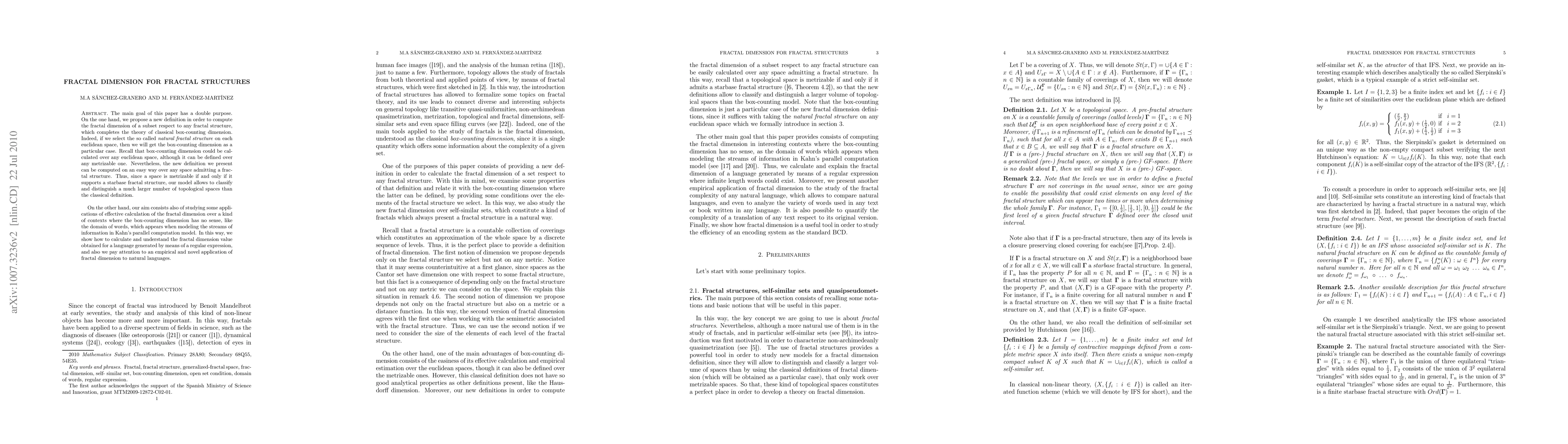 The main goal of this paper has a double purpose. On the one hand, we propose a new definition in order to compute the fractal dimension of a subset respect to any fractal structure, which completes the theory of classical box-counting dimension. Indeed, if we select the so called natural fractal structure on each euclidean space, then we will get the box-counting dimension as a particular case. Recall that box-counting dimension could be calculated over any euclidean space, although it can be defined over any metrizable one. Nevertheless, the new definition we present can be computed on an easy way over any space admitting a fractal structure. Thus, since a space is metrizable if and only if it supports a starbase fractal structure, our model allows to classify and distinguish a much larger number of topological spaces than the classical definition. On the other hand, our aim consists also of studying some applications of effective calculation of the fractal dimension over a kind of contexts where the box-counting dimension has no sense, like the domain of words, which appears when modeling the streams of information in Kahn's parallel computation model. In this way, we show how to calculate and understand the fractal dimension value obtained for a language generated by means of a regular expression, and also we pay attention to an empirical and novel application of fractal dimension to natural languages.