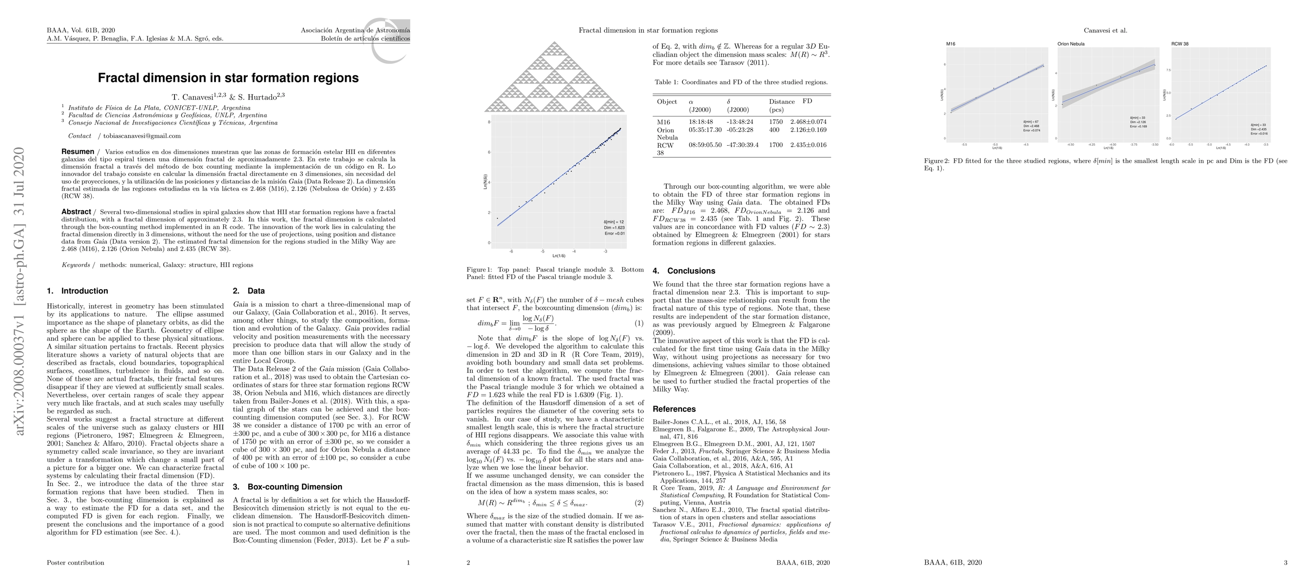 Several two-dimensional studies in spiral galaxies show that HII star formation regions have a fractal distribution, with a fractal dimension of approximately 2.3. In this work, the fractal dimension is calculated through the box-counting method implemented in an R code. The innovation of the work lies in calculating the fractal dimension directly in 3 dimensions, without the need for the use of projections, using position and distance data from Gaia (Data version 2). The estimated fractal dimension for the regions studied in the Milky Way are 2.468 (M16), 2.126 (Orion Nebula) and 2.435 (RCW 38).