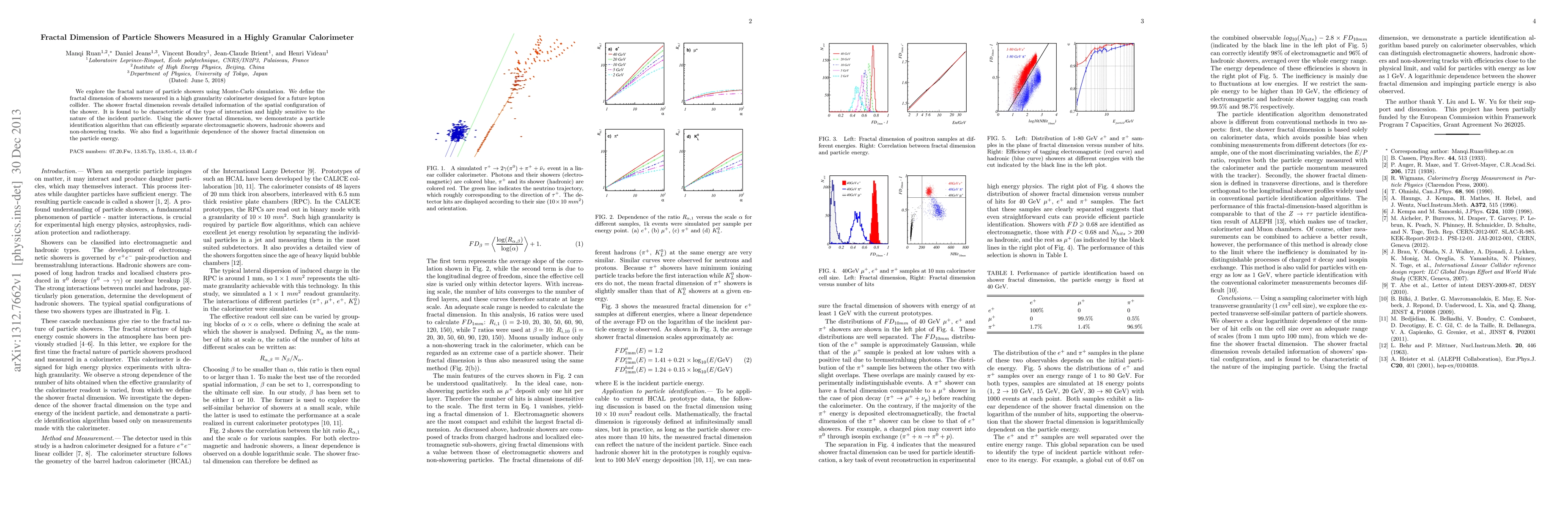 This paper investigates the fractal dimension of particle showers in a highly granular calorimeter, revealing its characteristic nature for different particle interactions. The fractal dimension serves as a basis for a particle identification algorithm that distinguishes electromagnetic, hadronic showers, and non-showering tracks, with a logarithmic energy dependence observed.