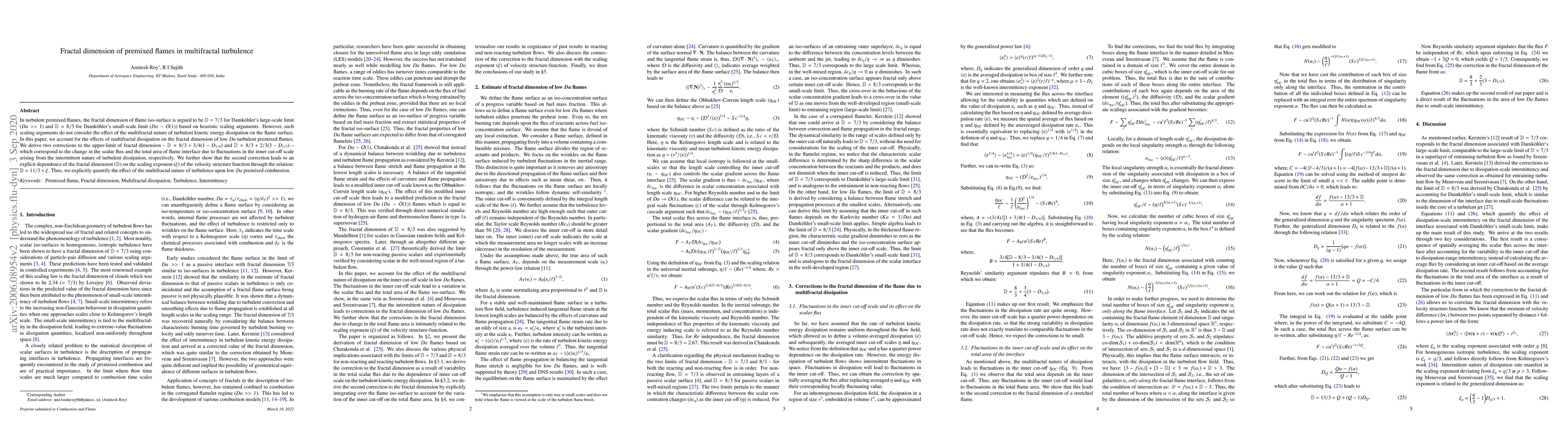 The paper presents a detailed derivation of fractal dimension corrections for low Da premixed flames, explicitly accounting for the multifractal nature of turbulent dissipation.