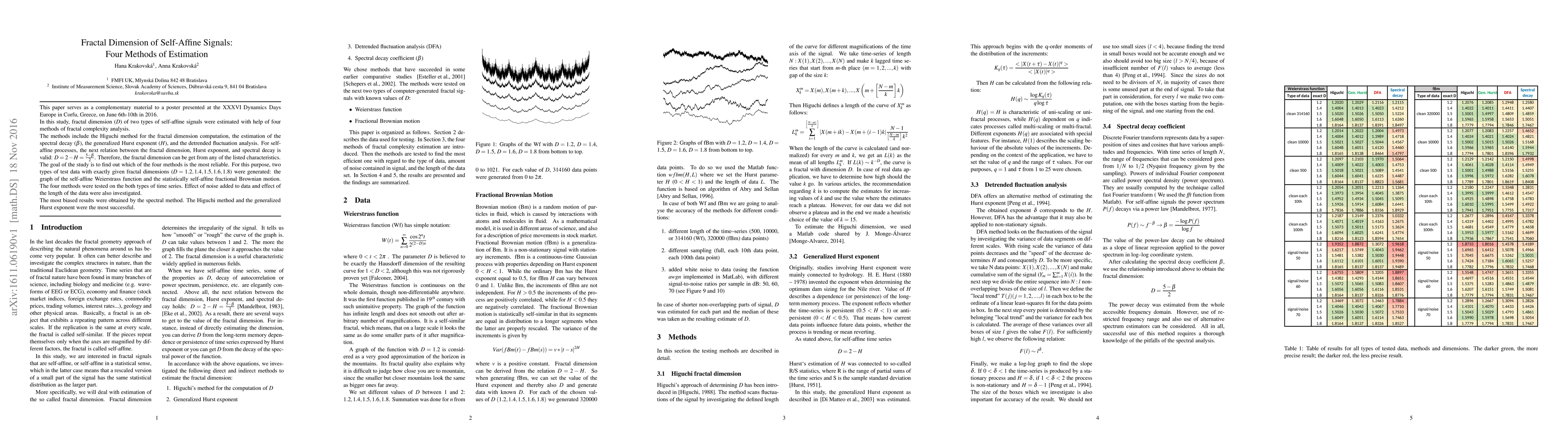 This study evaluates four methods for estimating the fractal dimension of self-affine signals: Higuchi method, spectral decay, generalized Hurst exponent, and detrended fluctuation analysis. The most reliable results were found with the Higuchi method and generalized Hurst exponent, while spectral decay was the least effective.