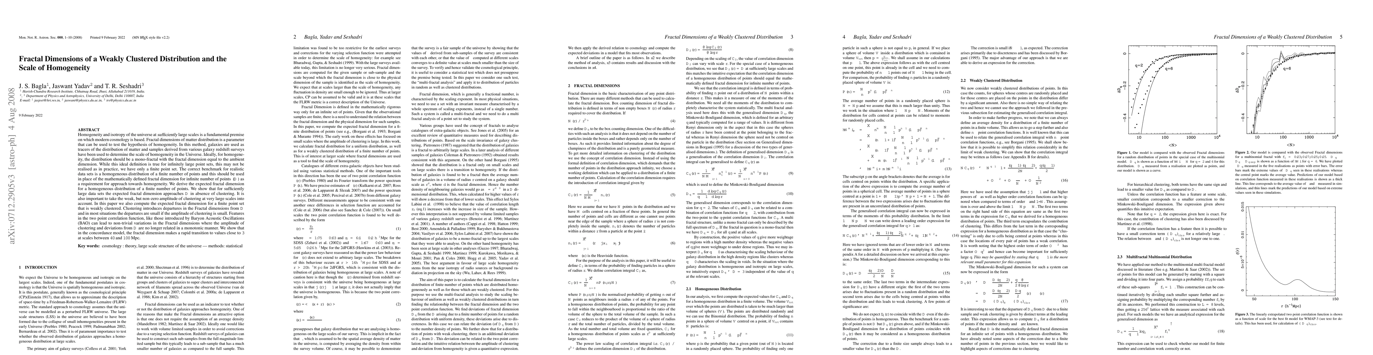 This paper explores the fractal dimensions of a weakly clustered galaxy distribution to determine the scale of homogeneity in the universe. It derives the expected fractal dimension for both homogeneous and weakly clustered finite point sets, showing that clustering introduces small deviations from the ideal fractal dimension, with notable variations arising from features like Baryon Acoustic Oscillations.