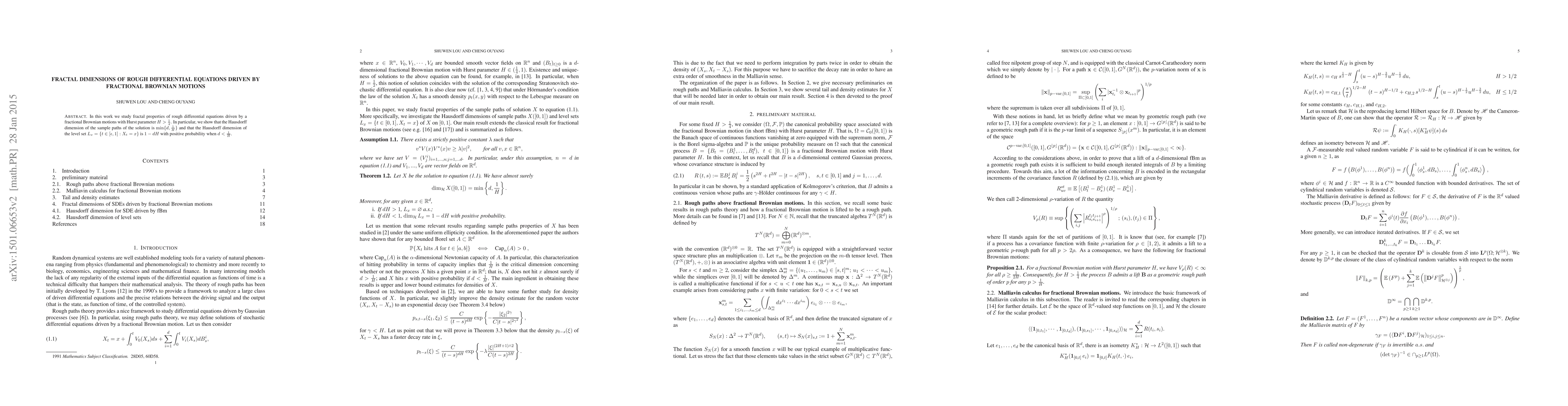 This paper investigates the fractal dimensions of solutions to rough differential equations driven by fractional Brownian motion with $H>\frac{1}{4}$. It finds that the Hausdorff dimension of the sample paths is $\min\{d,\frac{1}{H}\}$, and the level set's dimension is $1-dH$ with positive probability when $d<\frac{1}{H}$.