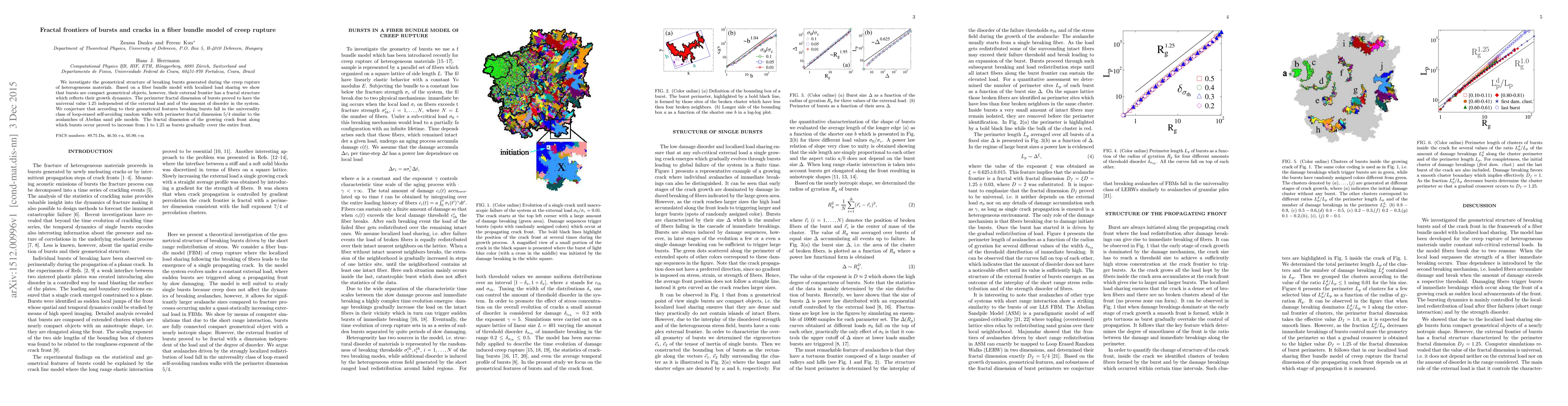 This paper explores the fractal geometry of breaking bursts during the creep rupture of heterogeneous materials using a fiber bundle model. The study finds that bursts exhibit a fractal perimeter with a universal fractal dimension of 1.25, akin to loop-erased self-avoiding random walks, and the crack front fractal dimension increases from 1 to 1.25 as bursts cover the entire front.