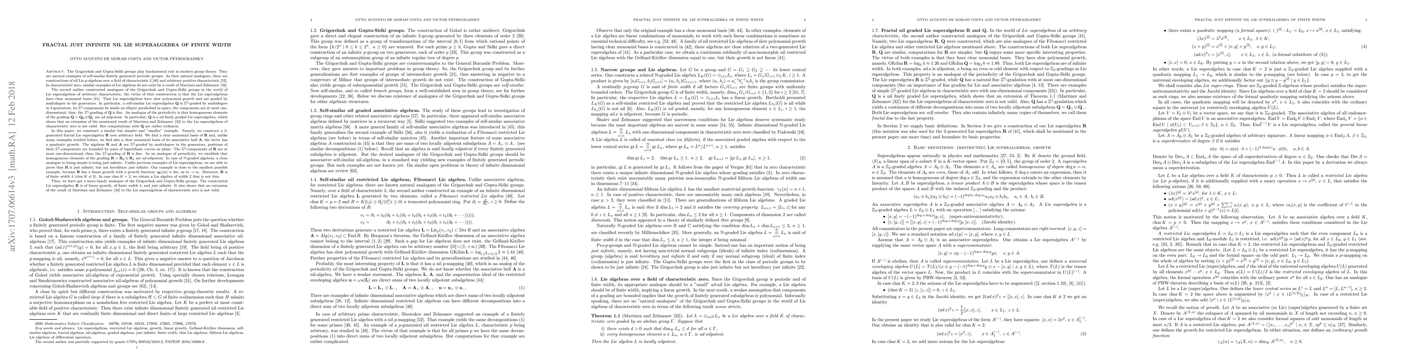 The Grigorchuk and Gupta-Sidki groups play fundamental role in modern group theory. Their natural analogues are self-similar nil Lie $p$-algebras. In characteristic zero, similar examples of Lie algebras do not exist (Martinez and Zelmanov). The second author recently constructed a 3-generated self-similar nil finely graded Lie superalgebra, which showed that an extension of Martinez-Zelmanov's result for Lie superalgebras of characteristic zero is not valid. Now, we suggest a more handy example. We construct a 2-generated self-similar Lie superalgebra $\mathbf{R}$ over arbitrary field. It has a clear monomial basis, unlike many examples studied before, we find a clear monomial basis of its associative hull $\mathbf{A}$, the latter has a quadratic growth. The algebras $\mathbf{R}$ and $\mathbf{A}$ are $\mathbb{Z}^2$-graded by multidegree in generators, positions of their $\mathbb{Z}^2$-components are bounded by pairs of logarithmic curves on plane. The $\mathbb{Z}^2$-components of $\mathbf{R}$ are at most one-dimensional, thus, the $\mathbb{Z}^2$-grading of $\mathbf{R}$ is fine. As an analogue of periodicity, we establish that homogeneous elements of the grading $\mathbf{R}=\mathbf{R}_{\bar 0}\oplus\mathbf{R}_{\bar 1}$ are $\mathrm{ad}$-nilpotent. In case of $\mathbb{N}$-graded algebras, a close analogue to being simple is being just-infinite. We prove that $\mathbf{R}$ is just infinite, but not hereditary just infinite. Our example is close to a smallest possible example, because $\mathbf{R}$ has a linear growth with a growth function $\gamma_\mathbf{R}(m)\approx 3m$, $m\to\infty$. Moreover, its degree $\mathbb{N}$-gradation is of width 4 ($\mathrm{char} K\ne 2$). In case $\mathrm{char}\, K=2$, we obtain a Lie algebra of width 2 that is not thin. Our example also shows that an extension of the result of Martinez and Zelmanov for Lie superalgebras of characteristic zero is not valid.