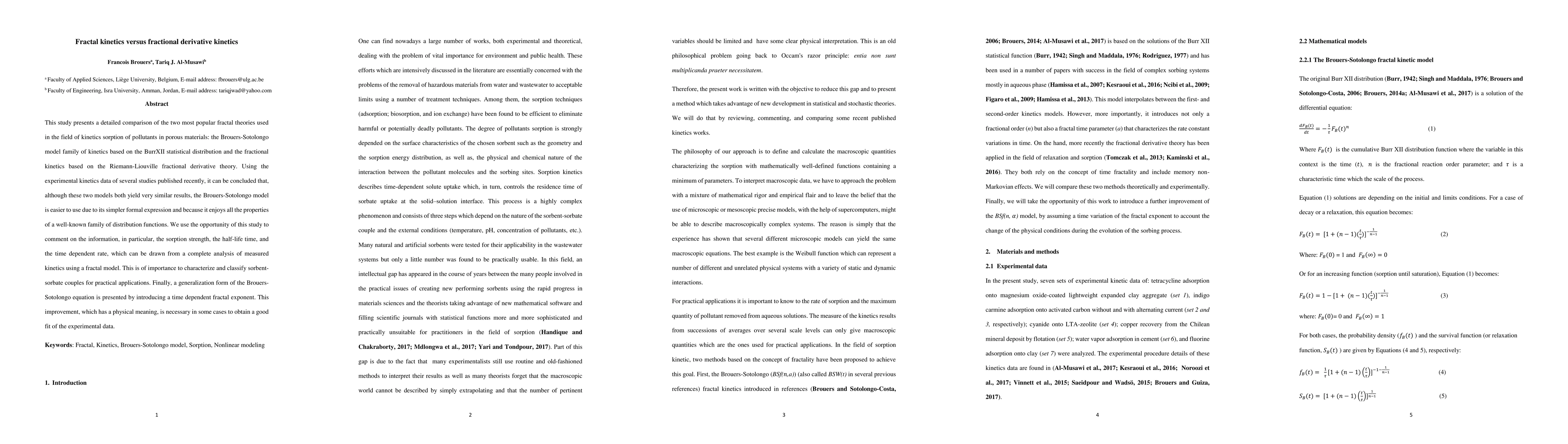 The research compares two fractal kinetics models: the Brouers-Sotolongo model family based on the BurrXII distribution and fractional kinetics based on the Riemann-Liouville fractional derivative theory, using experimental sorption kinetics data.