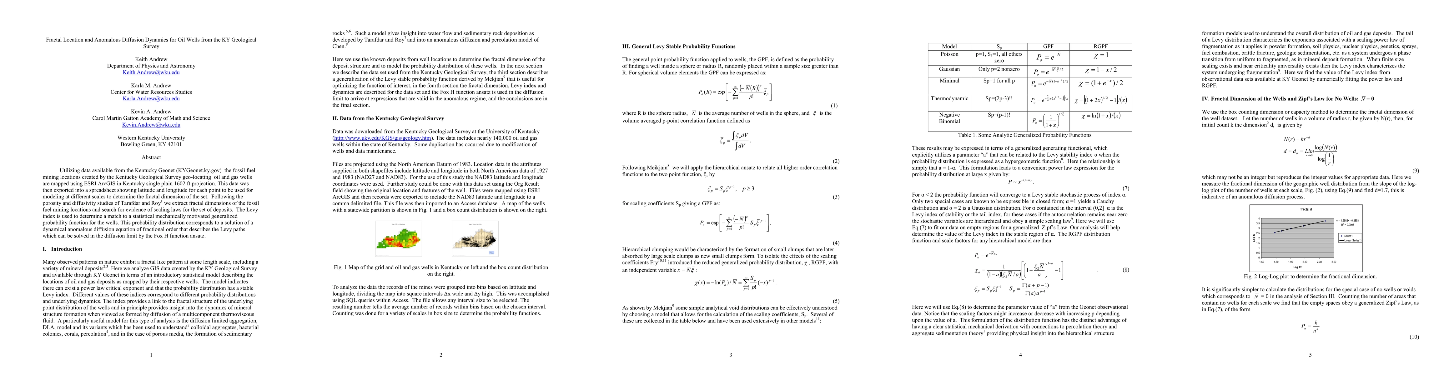 Utilizing data available from the Kentucky Geonet (KYGeonet.ky.gov) the fossil fuel mining locations created by the Kentucky Geological Survey geo-locating oil and gas wells are mapped using ESRI ArcGIS in Kentucky single plain 1602 ft projection. This data was then exported into a spreadsheet showing latitude and longitude for each point to be used for modeling at different scales to determine the fractal dimension of the set. Following the porosity and diffusivity studies of Tarafdar and Roy1 we extract fractal dimensions of the fossil fuel mining locations and search for evidence of scaling laws for the set of deposits. The Levy index is used to determine a match to a statistical mechanically motivated generalized probability function for the wells. This probability distribution corresponds to a solution of a dynamical anomalous diffusion equation of fractional order that describes the Levy paths which can be solved in the diffusion limit by the Fox H function ansatz.