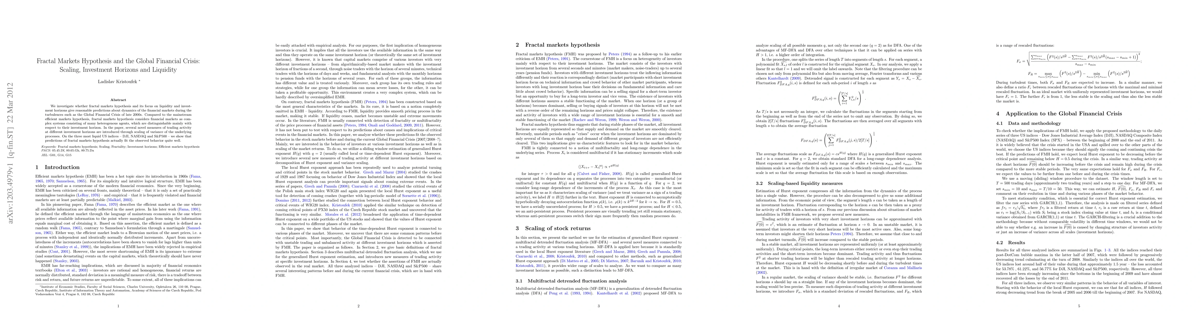 We investigate whether fractal markets hypothesis and its focus on liquidity and invest- ment horizons give reasonable predictions about dynamics of the financial markets during the turbulences such as the Global Financial Crisis of late 2000s. Compared to the mainstream efficient markets hypothesis, fractal markets hypothesis considers financial markets as com- plex systems consisting of many heterogenous agents, which are distinguishable mainly with respect to their investment horizon. In the paper, several novel measures of trading activity at different investment horizons are introduced through scaling of variance of the underlying processes. On the three most liquid US indices - DJI, NASDAQ and S&P500 - we show that predictions of fractal markets hypothesis actually fit the observed behavior quite well.