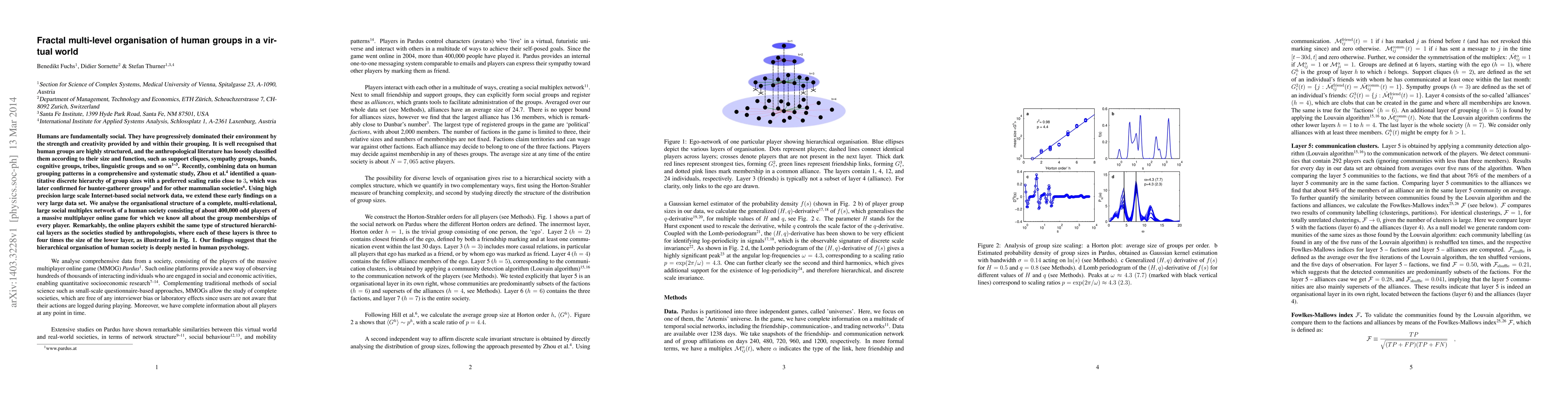 This paper investigates the fractal multi-level organisation of human groups within a massive multiplayer online game, revealing a hierarchical structure similar to that found in anthropological studies of hunter-gatherer and mammalian societies, with a preferred scaling ratio of approximately $3$. The findings suggest a deeply ingrained psychological basis for this organisational pattern.
