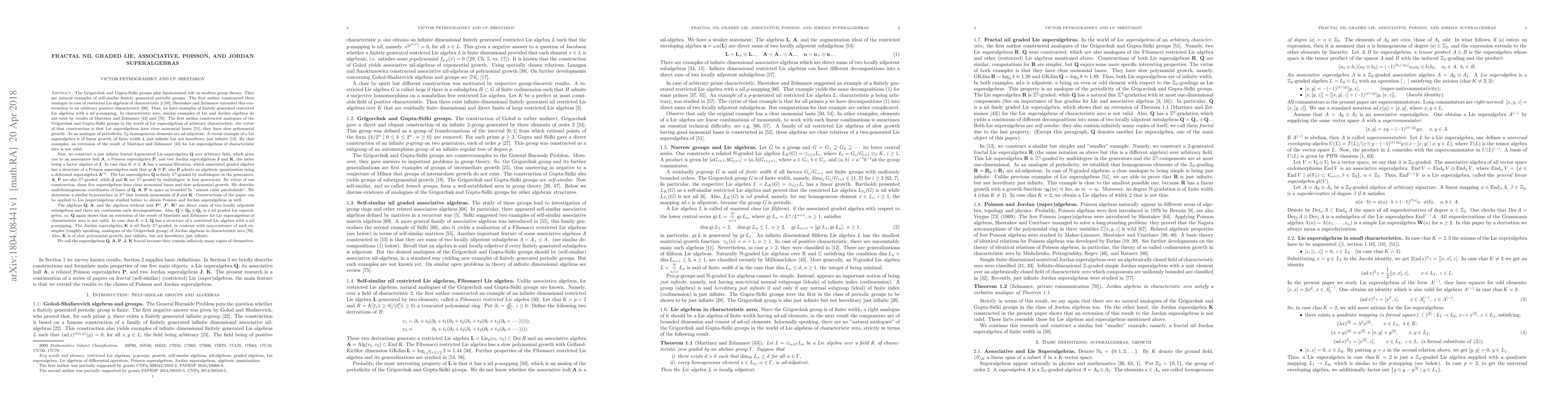 We construct a just infinite fractal 3-generated Lie superalgebra $\mathbf Q$ over arbitrary field, which gives rise to an associative hull $\mathbf A$, a Poisson superalgebra $\mathbf P$, and two Jordan superalgebras $\mathbf J$, $\mathbf K$. One has a natural filtration for $\mathbf A$ which associated graded algebra has a structure of a Poisson superalgebra and $\mathrm{gr} \mathbf A\cong\mathbf P$, also $\mathbf P$ admits an algebraic quantization. The Lie superalgebra $\mathbf Q$ is finely $\mathbb Z^3$-graded by multidegree in the generators, $\mathbf A$, $\mathbf P$ are $\mathbb Z^3$-graded, while $\mathbf J$, $\mathbf K$ are $\mathbb{Z}^4$-graded. These five superalgebras have clear monomial bases and slow polynomial growth. We describe multihomogeneous coordinates of bases of $\mathbf Q$, $\mathbf A$, $\mathbf P$ in space as bounded by "almost cubic paraboloids". A similar hypersurface in $\mathbb R^4$ bounds monomials of $\mathbf J$, $\mathbf K$. Constructions of the paper can be applied to Lie superalgebras studied before and get Poisson and Jordan superalgebras as well. The algebras ${\mathbf Q}$, ${\mathbf A}$, and the algebras without unit $\mathbf P^o$, $\mathbf J^o$, $\mathbf K^o$ are direct sums of two locally nilpotent subalgebras and there are continuum such decompositions. Also, $\mathbf Q=\mathbf Q_{\bar 0}\oplus \mathbf Q_{\bar 1}$ is a nil graded Lie superalgebra. In case $\mathrm{char}\, K=2$, $\mathbf Q$ has a structure of a restricted Lie algebra with a nil $p$-mapping. The Jordan superalgebra $\mathbf K$ is just infinite nil finely $\mathbb Z^4$-graded, while such examples (say, analogues of the Grigorchuk group) of Lie and Jordan algebras in characteristic zero do not exist. We call $\mathbf Q$, $\mathbf A$, $\mathbf P$, $\mathbf J$, $\mathbf K$ fractal because they contain infinitely many copies of themselves.