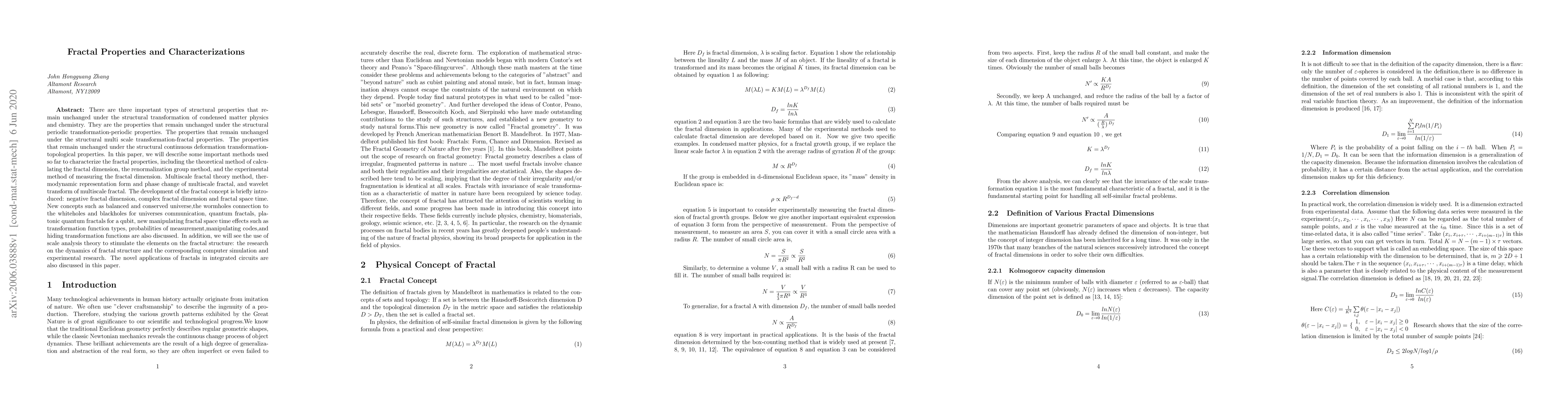 This paper explores the characterization of fractal properties in condensed matter physics and chemistry, detailing methods like fractal dimension calculation, renormalization group, and experimental measurement. It also introduces advanced concepts such as quantum fractals, fractal space-time, and applications in integrated circuits, alongside theoretical discussions on multiscale fractal theory and scale analysis.