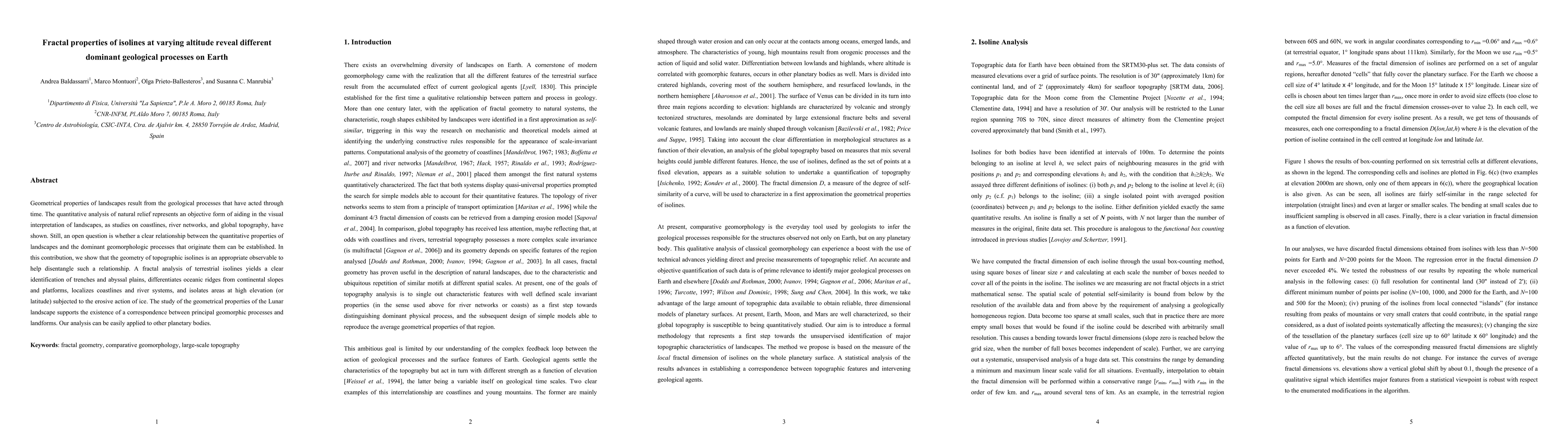 Geometrical properties of landscapes result from the geological processes that have acted through time. The quantitative analysis of natural relief represents an objective form of aiding in the visual interpretation of landscapes, as studies on coastlines, river networks, and global topography, have shown. Still, an open question is whether a clear relationship between the quantitative properties of landscapes and the dominant geomorphologic processes that originate them can be established. In this contribution, we show that the geometry of topographic isolines is an appropriate observable to help disentangle such a relationship. A fractal analysis of terrestrial isolines yields a clear identification of trenches and abyssal plains, differentiates oceanic ridges from continental slopes and platforms, localizes coastlines and river systems, and isolates areas at high elevation (or latitude) subjected to the erosive action of ice. The study of the geometrical properties of the lunar landscape supports the existence of a correspondence between principal geomorphic processes and landforms. Our analysis can be easily applied to other planetary bodies.