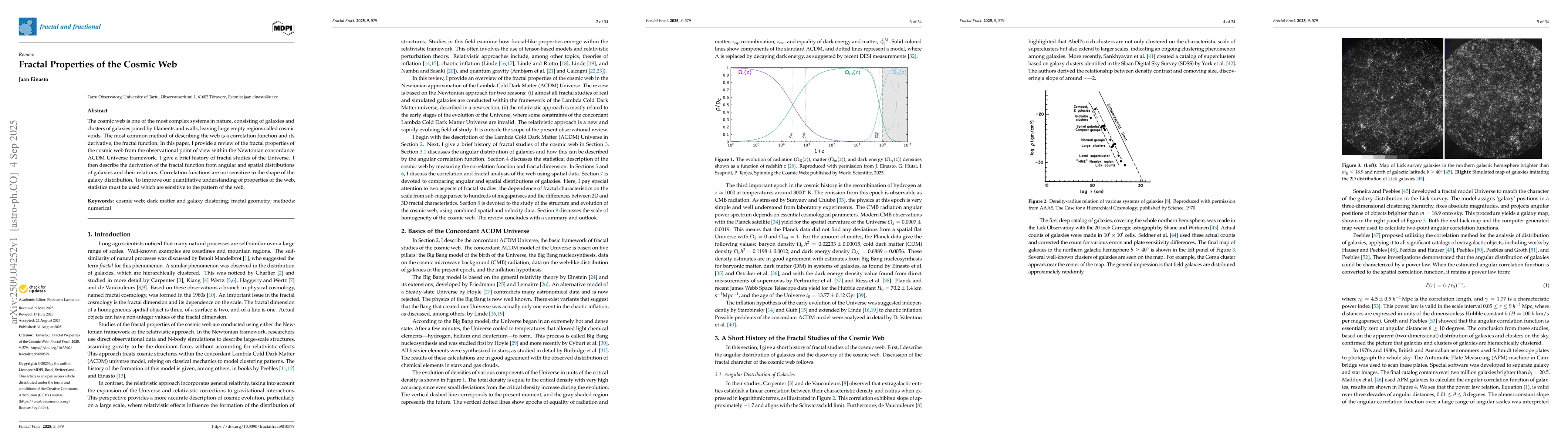 The cosmic web is one of the most complex systems in nature, consisting of galaxies and clusters of galaxies joined by filaments and walls, leaving large empty regions called cosmic voids. The most common method of describing the web is a correlation function and its derivative, the fractal function. In this paper, I provide a review of the fractal properties of the cosmic web from the observational point of view within the Newtonian concordance $\Lambda$CDM Universe framework. I give a brief history of fractal studies of the Universe. I then describe the derivation of the fractal function from angular and spatial distributions of galaxies and their relations. Correlation functions are not sensitive to the shape of the galaxy distribution. To improve our quantitative understanding of properties of the web, statistics must be used which are sensitive to the pattern of the web.