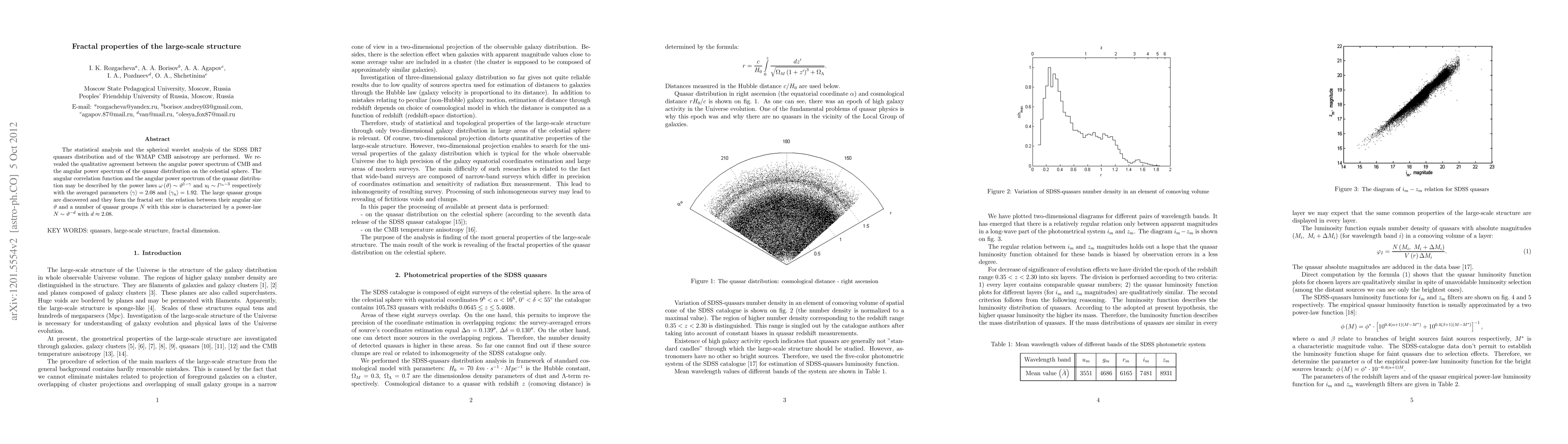 The statistical analysis and the spherical wavelet analysis of the SDSS DR7 quasars distribution and of the WMAP CMB anisotropy are performed. They revealed the qualitative agreement between the angular power spectrum of CMB and the angular power spectrum of the quasar distribution on the celestial sphere. The angular correlation function and the angular power spectrum of the quasar distribution may be described by the power laws. The large quasar groups are discovered and they form the fractal set: the relation between their angular size and a number of quasar groups with this size is characterized by a power-law with fractal dimension 2.08.