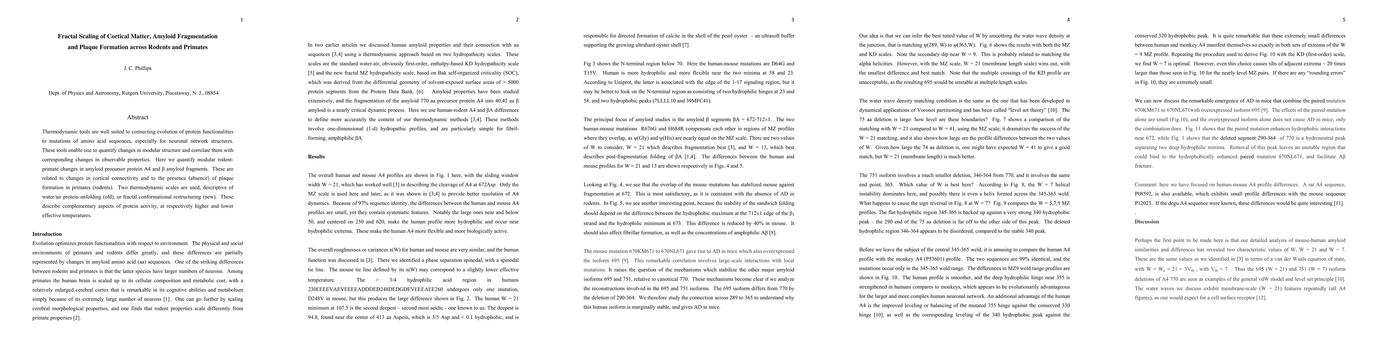 Thermodynamic tools are well suited to connecting evolution of protein functionalities to mutations of amino acid sequences, especially for neuronal network structures. These tools enable one to quantify changes in modular structure and correlate them with corresponding changes in observable properties. Here we quantify modular rodent-primate changes in amyloid precursor protein A4 and \b{eta} amyloid fragments. These are related to changes in cortical connectivity and to the presence (absence) of plaque formation in primates (rodents). Two thermodynamic scales are used, descriptive of water/air protein unfolding (old), or fractal conformational restructuring (new). These describe complementary aspects of protein activity, at respectively higher and lower effective temperatures.