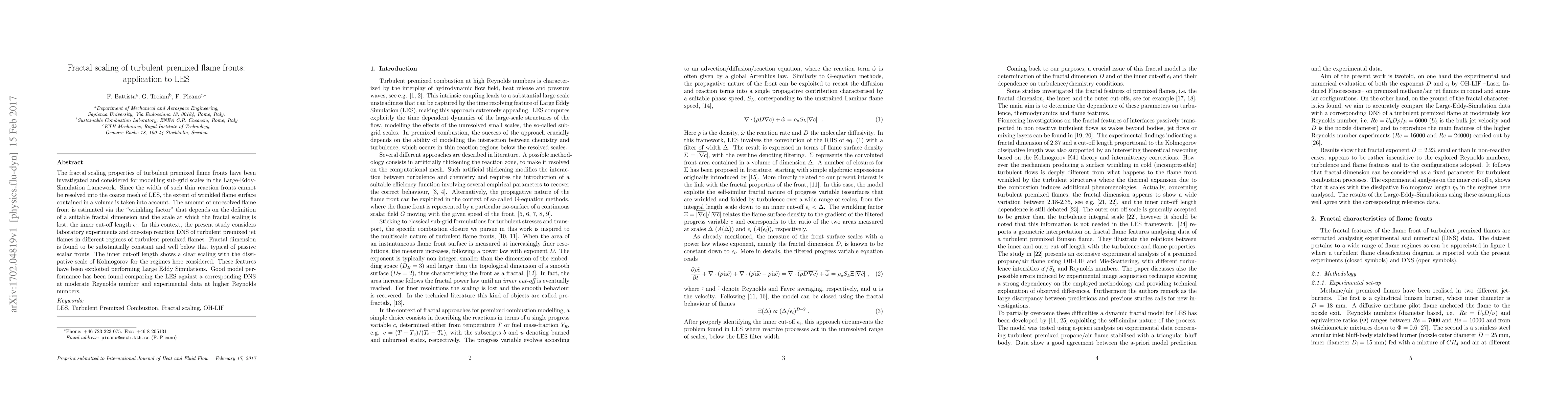 This paper investigates fractal scaling properties of turbulent premixed flame fronts to model sub-grid scales in Large-Eddy Simulations (LES). The study finds a constant fractal dimension and a scaling relationship with the inner cut-off length, which aids in accurately simulating turbulent premixed jet flames across different Reynolds number regimes.