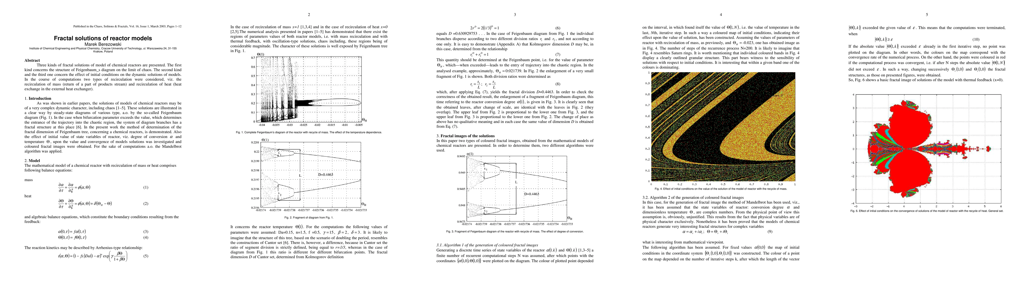 Three kinds of fractal solutions of model of reactors are presented. The first kind concerns the structure of Feigenbaum_s diagram on the limit of chaos. The second kind and the third one concern the effect of initial conditions on the dynamic solutions of models. In the course of computations two types of recirculation were considered, viz. the recirculation of mass (return of a part of products stream) and recirculation of heat (heat exchange in the external heat exchanger).