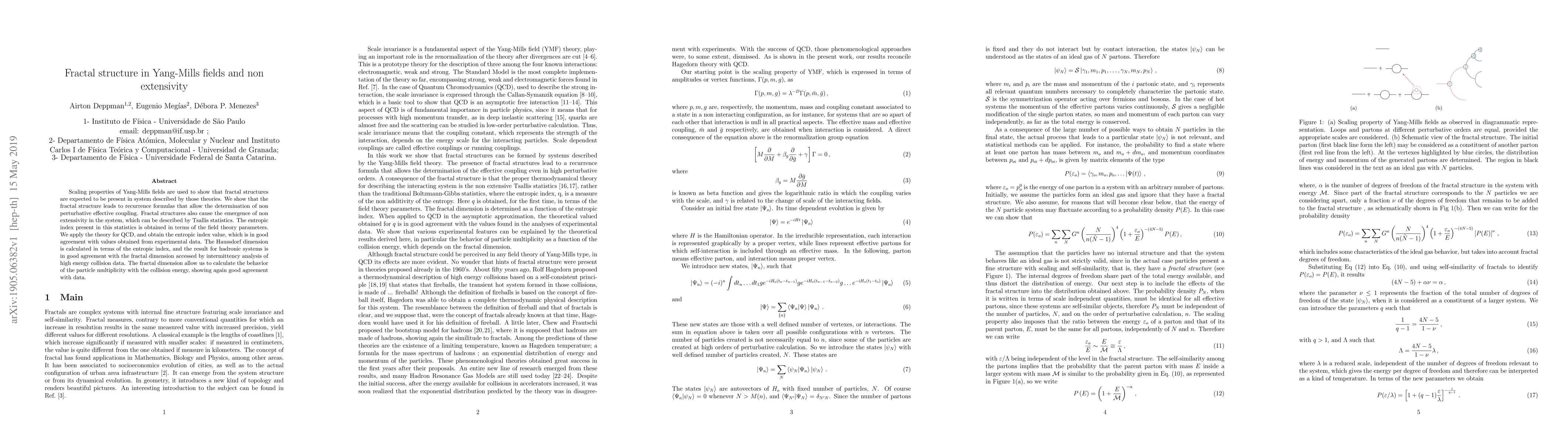 Scaling properties of Yang-Mills fields are used to show that fractal structures are expected to be present in system described by those theories. We show that the fractal structure leads to recurrence formulas that allow the determination of non perturbative effective coupling. Fractal structures also cause the emergence of non extensivity in the system, which can be described by Tsallis statistics. The entropic index present in this statistics is obtained in terms of the field theory parameters. We apply the theory for QCD, and obtain the entropic index value, which is in good agreement with values obtained from experimental data. The Haussdorf dimension is calculated in terms of the entropic index, and the result for hadronic systems is in good agreement with the fractal dimension accessed by intermittency analysis of high energy collision data. The fractal dimension allow us to calculate the behavior of the particle multiplicity with the collision energy, showing again good agreement with data.