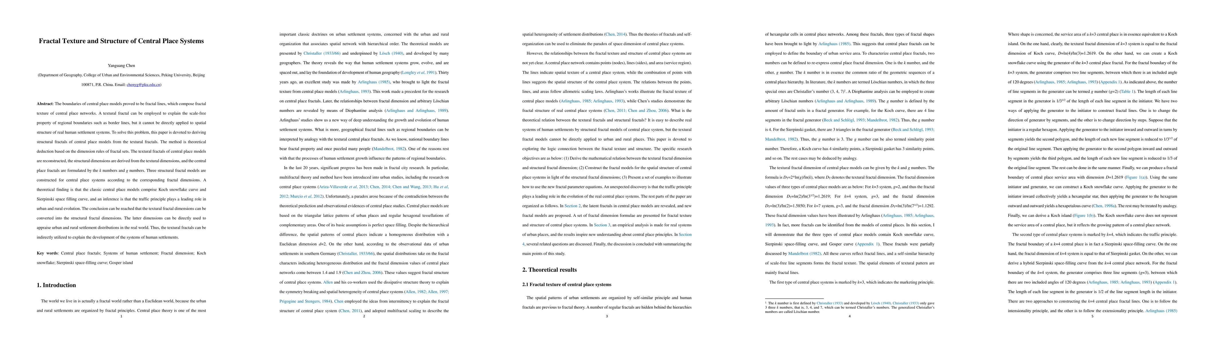 Researchers found that central place models have fractal structures, which can help explain scale-free properties of regional boundaries and settlement systems. They developed three new fractal models to analyze urban and rural distributions.