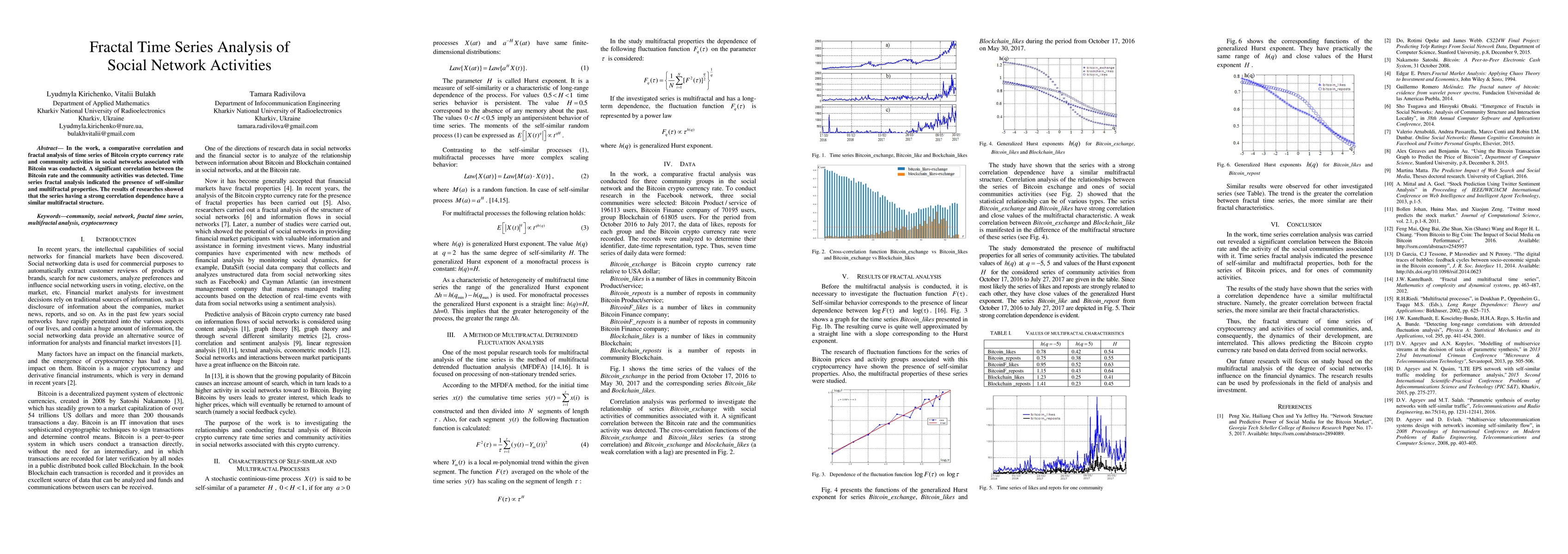 In the work, a comparative correlation and fractal analysis of time series of Bitcoin crypto currency rate and community activities in social networks associated with Bitcoin was conducted. A significant correlation between the Bitcoin rate and the community activities was detected. Time series fractal analysis indicated the presence of self-similar and multifractal properties. The results of researches showed that the series having a strong correlation dependence have a similar multifractal structure.