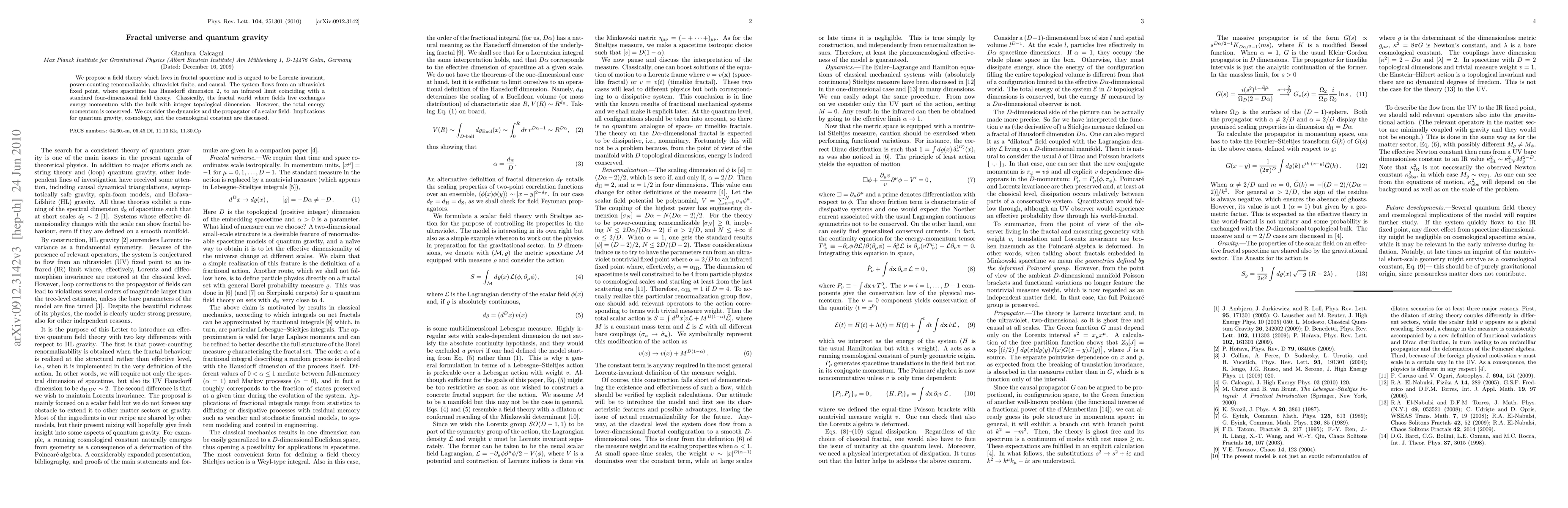 We propose a field theory which lives in fractal spacetime and is argued to be Lorentz invariant, power-counting renormalizable, ultraviolet finite, and causal. The system flows from an ultraviolet fixed point, where spacetime has Hausdorff dimension 2, to an infrared limit coinciding with a standard four-dimensional field theory. Classically, the fractal world where fields live exchanges energy momentum with the bulk with integer topological dimension. However, the total energy momentum is conserved. We consider the dynamics and the propagator of a scalar field. Implications for quantum gravity, cosmology, and the cosmological constant are discussed.
