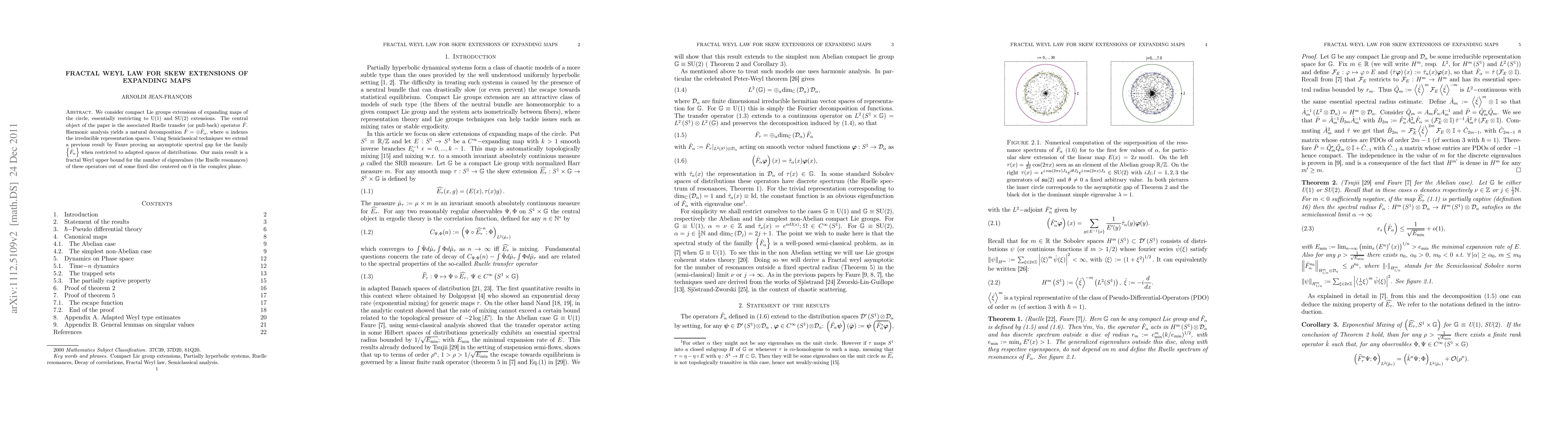 This paper investigates compact Lie group extensions of expanding maps on the circle, focusing on U(1) and SU(2) cases. It establishes a fractal Weyl law for the Ruelle transfer operator's eigenvalues, proving an asymptotic spectral gap and providing an upper bound for the number of these eigenvalues outside a fixed disc in the complex plane.