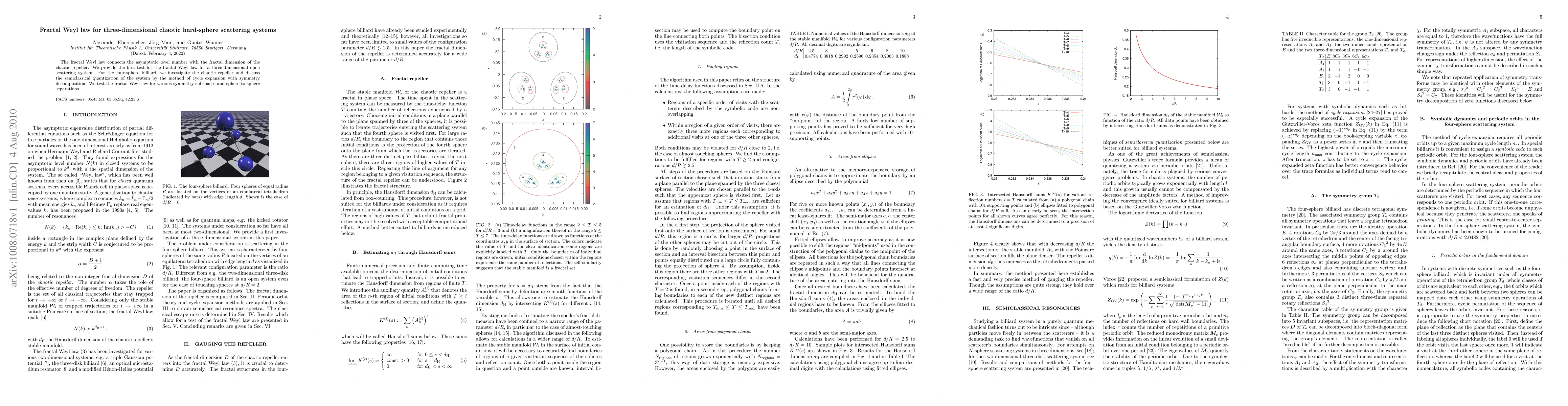 The fractal Weyl law connects the asymptotic level number with the fractal dimension of the chaotic repeller. We provide the first test for the fractal Weyl law for a three-dimensional open scattering system. For the four-sphere billiard, we investigate the chaotic repeller and discuss the semiclassical quantization of the system by the method of cycle expansion with symmetry decomposition. We test the fractal Weyl law for various symmetry subspaces and sphere-to-sphere separations.