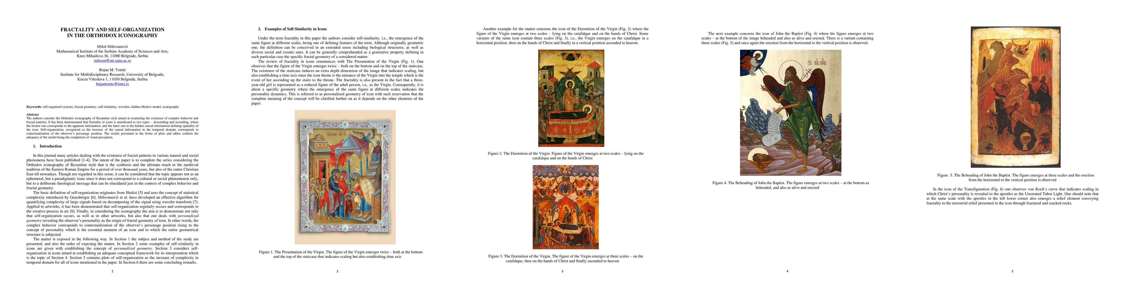 This paper explores Byzantine Orthodox iconography for fractal patterns and self-organization, identifying two types of fractality: descending for apparent information and ascending for hidden causal information. The study confirms the model's adequacy in completing visual perception through self-organization and contextual observer positioning.