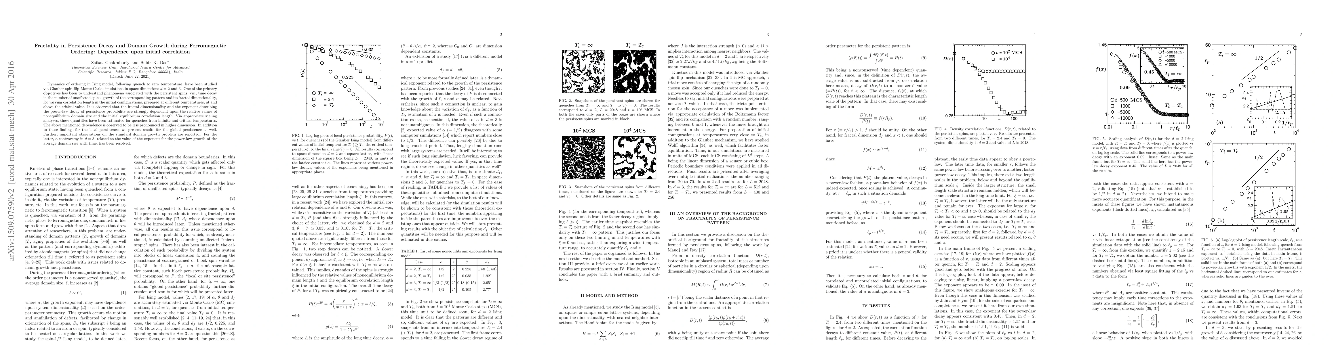 Dynamics of ordering in Ising model, following quench to zero temperature, have been studied via Glauber spin-flip Monte Carlo simulations in space dimensions $d=2$ and $3$. One of the primary objectives has been to understand phenomena associated with the persistent spins, viz., time decay in the number of unaffected spins, growth of the corresponding pattern and its fractal dimensionality, for varying correlation length in the initial configurations, prepared at different temperatures, at and above the critical value. It is observed that the fractal dimensionality and the exponent describing the power-law decay of persistence probability are strongly dependent upon the relative values of nonequilibrium domain size and the initial equilibrium correlation length. Via appropriate scaling analyses, these quantities have been estimated for quenches from infinite and critical temperatures. The above mentioned dependence is observed to be less pronounced in higher dimension. In addition to these findings for the local persistence, we present results for the global persistence as well. Further, important observations on the standard domain growth problem are reported. For the latter, a controversy in $d=3$, related to the value of the exponent for the power-law growth of the average domain size with time, has been resolved.