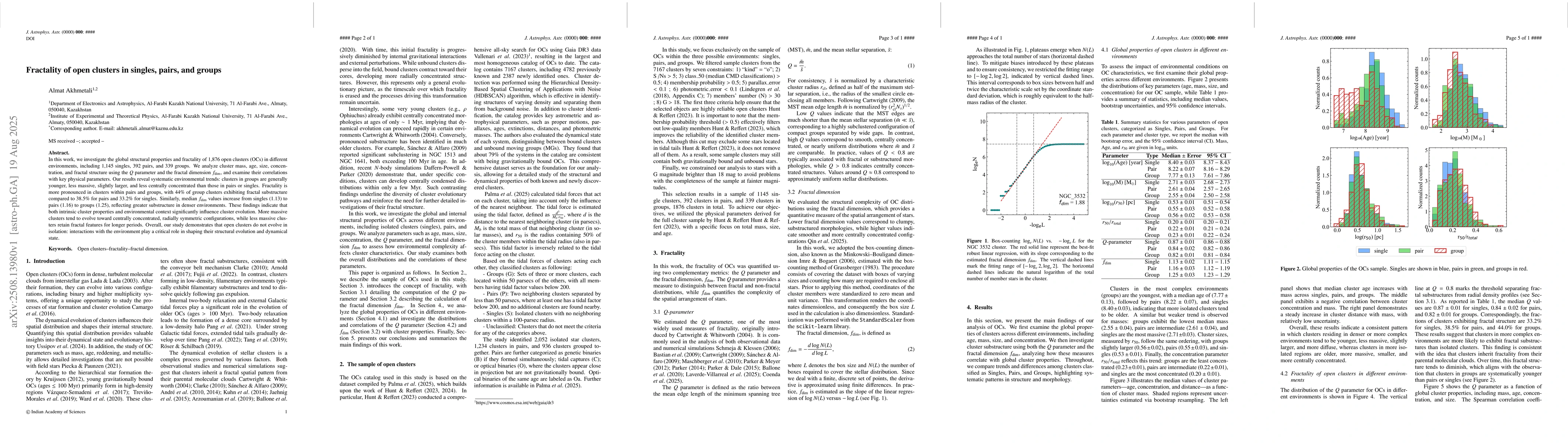 In this work, we investigate the global structural properties and fractality of 1,876 open clusters (OCs) in different environments, including 1,145 singles, 392 pairs, and 339 groups. We analyze cluster mass, age, size, concentration, and fractal structure using the Q parameter and the fractal dimension fdim, and examine their correlations with key physical parameters. Our results reveal systematic environmental trends: clusters in groups are generally younger, less massive, slightly larger, and less centrally concentrated than those in pairs or singles. Fractality is more pronounced in clusters within pairs and groups, with 44% of group clusters exhibiting fractal substructure compared to 38.5% for pairs and 33.2% for singles. Similarly, median fdim values increase from singles (1.13) to pairs (1.16) to groups (1.25), reflecting greater substructure in denser environments. These findings indicate that both intrinsic cluster properties and environmental context significantly influence cluster evolution. More massive clusters tend to evolve toward centrally concentrated, radially symmetric configurations, while less massive clusters retain fractal features for longer periods. Overall, our study demonstrates that open clusters do not evolve in isolation: interactions with the environment play a critical role in shaping their structural evolution and dynamical state.