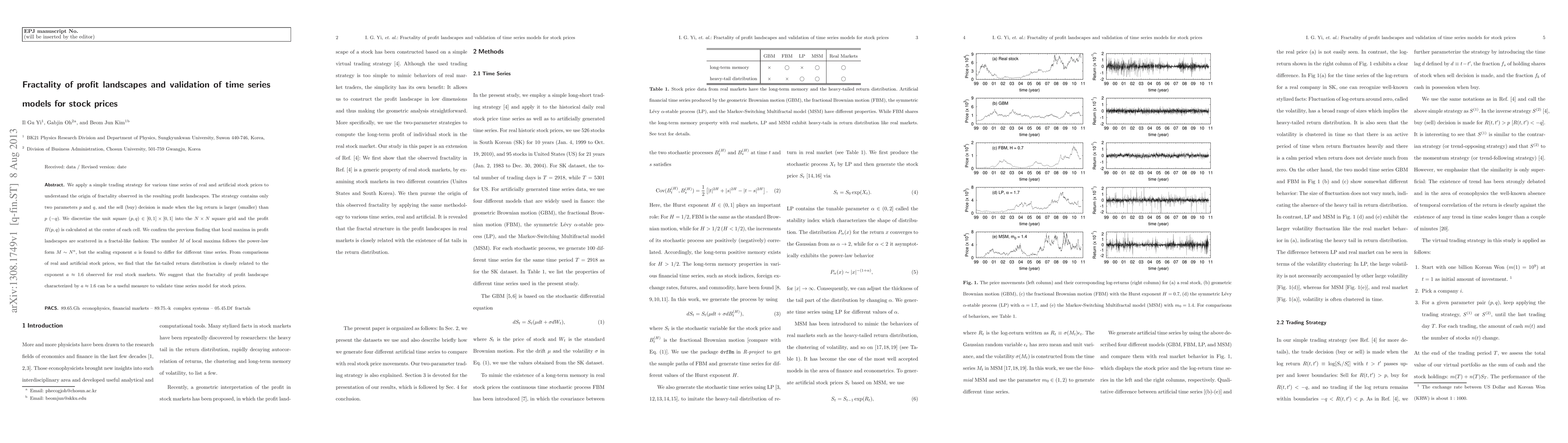 We apply a simple trading strategy for various time series of real and artificial stock prices to understand the origin of fractality observed in the resulting profit landscapes. The strategy contains only two parameters $p$ and $q$, and the sell (buy) decision is made when the log return is larger (smaller) than $p$ ($-q$). We discretize the unit square $(p, q) \in [0, 1] \times [0, 1]$ into the $N \times N$ square grid and the profit $\Pi (p, q)$ is calculated at the center of each cell. We confirm the previous finding that local maxima in profit landscapes are scattered in a fractal-like fashion: The number M of local maxima follows the power-law form $M \sim N^{a}$, but the scaling exponent $a$ is found to differ for different time series. From comparisons of real and artificial stock prices, we find that the fat-tailed return distribution is closely related to the exponent $a \approx 1.6$ observed for real stock markets. We suggest that the fractality of profit landscape characterized by $a \approx 1.6$ can be a useful measure to validate time series model for stock prices.