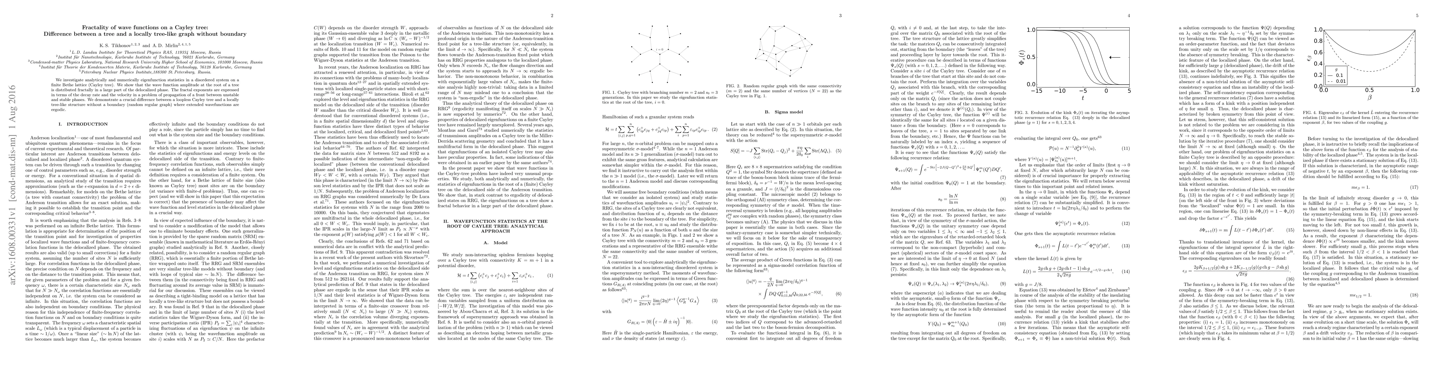 The paper presents a detailed analytical and numerical study of eigenfunction statistics on a Cayley tree, identifying fractal behavior and its distinction from ergodic behavior on random regular graphs.