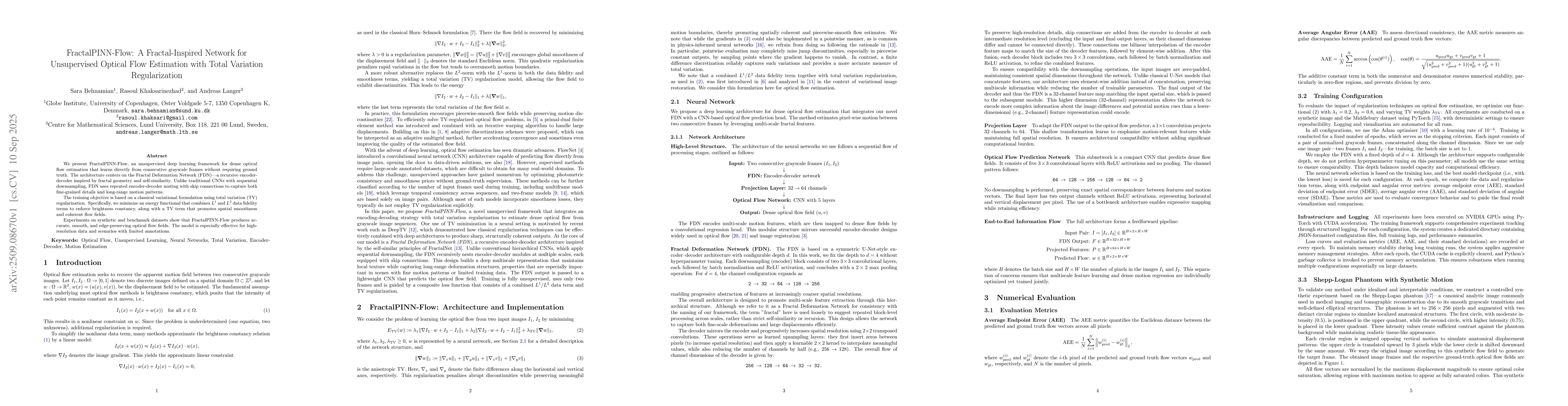 We present FractalPINN-Flow, an unsupervised deep learning framework for dense optical flow estimation that learns directly from consecutive grayscale frames without requiring ground truth. The architecture centers on the Fractal Deformation Network (FDN) - a recursive encoder-decoder inspired by fractal geometry and self-similarity. Unlike traditional CNNs with sequential downsampling, FDN uses repeated encoder-decoder nesting with skip connections to capture both fine-grained details and long-range motion patterns. The training objective is based on a classical variational formulation using total variation (TV) regularization. Specifically, we minimize an energy functional that combines $L^1$ and $L^2$ data fidelity terms to enforce brightness constancy, along with a TV term that promotes spatial smoothness and coherent flow fields. Experiments on synthetic and benchmark datasets show that FractalPINN-Flow produces accurate, smooth, and edge-preserving optical flow fields. The model is especially effective for high-resolution data and scenarios with limited annotations.