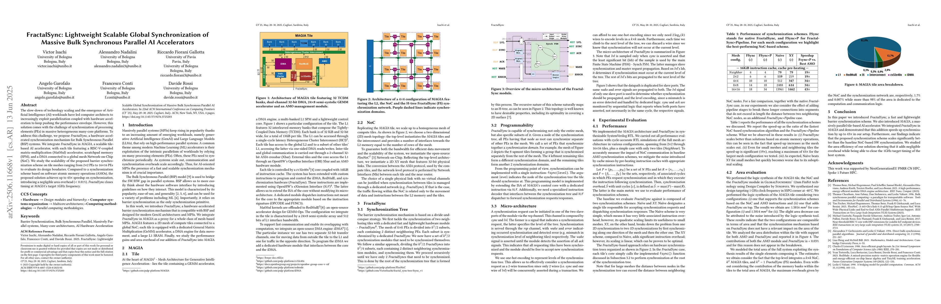 The slow-down of technology scaling and the emergence of Artificial Intelligence (AI) workloads have led computer architects to increasingly exploit parallelization coupled with hardware acceleration to keep pushing the performance envelope. However, this solution comes with the challenge of synchronization of processing elements (PEs) in massive heterogeneous many-core platforms. To address this challenge, we propose FractalSync, a hardware accelerated synchronization mechanism for Bulk Synchronous Parallel (BSP) systems. We integrate FractalSync in MAGIA, a scalable tile-based AI accelerator, with each tile featuring a RISC-V-coupled matrix-multiplication (MatMul) accelerator, scratchpad memory (SPM), and a DMA connected to a global mesh Network-on-Chip (NoC). We study the scalability of the proposed barrier synchronization scheme on tile meshes ranging from 2x2 PEs to 16x16 PEs to evaluate its design boundaries. Compared to a synchronization scheme based on software atomic memory operations (AMOs), the proposed solution achieves up to 43x speedup on synchronization, introducing a negligible area overhead (<0.01%). FractalSync closes timing at MAGIA's target 1GHz frequency.