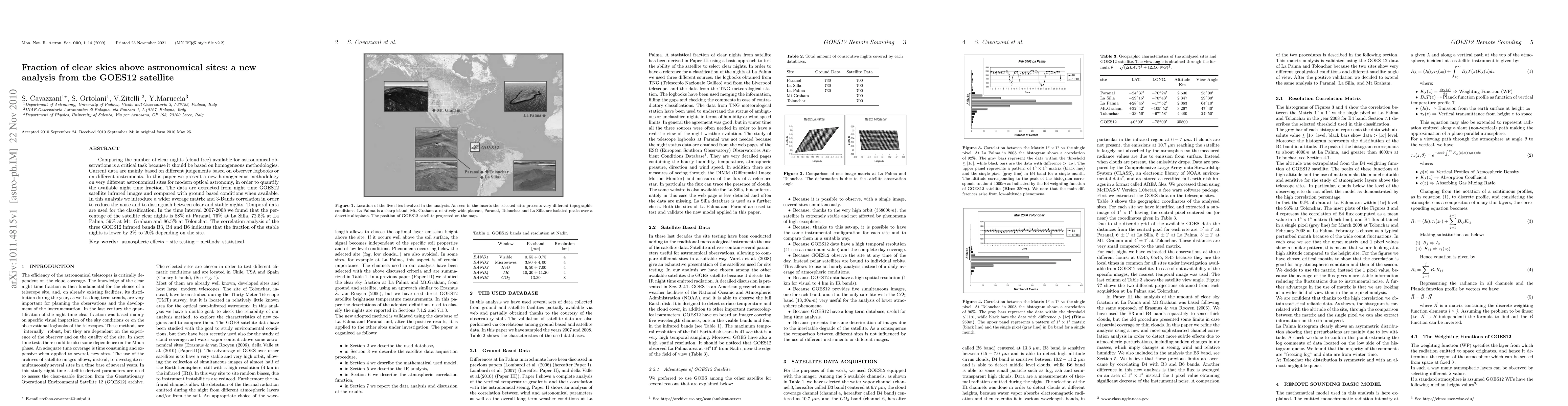 This paper introduces a new methodology using GOES12 satellite data to quantify clear night fractions for astronomical observations across various sites, finding 88% clear nights at Paranal and 59% at Mt. Graham in 2007-2008. The study employs a wider average matrix and 3-Band correlation to distinguish clear skies, reducing noise and improving accuracy.