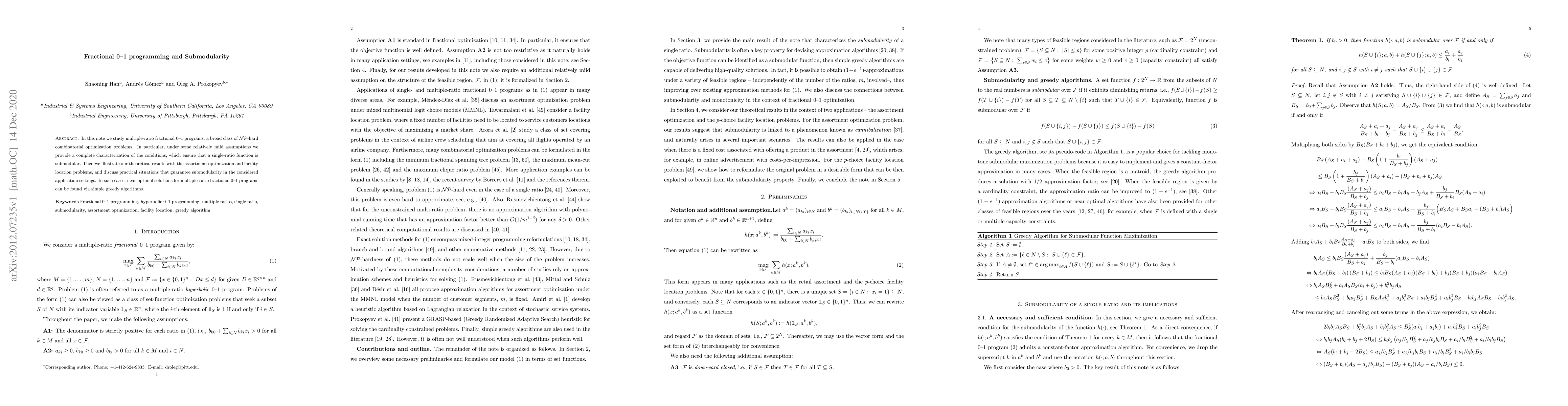 This paper characterizes conditions ensuring submodularity for single-ratio functions in multiple-ratio fractional 0-1 programs, illustrating its application in assortment optimization and facility location. Near-optimal solutions for these problems can be achieved using greedy algorithms when submodularity holds.